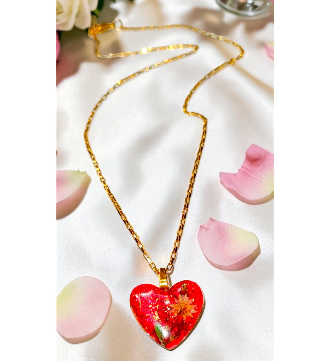 Χειροποιητο Κολιε -Καρδια- με φυσικα λουλουδια και gliter σε καρδια απο υγρο γυαλι.Ατσαλινη αλυσιδα