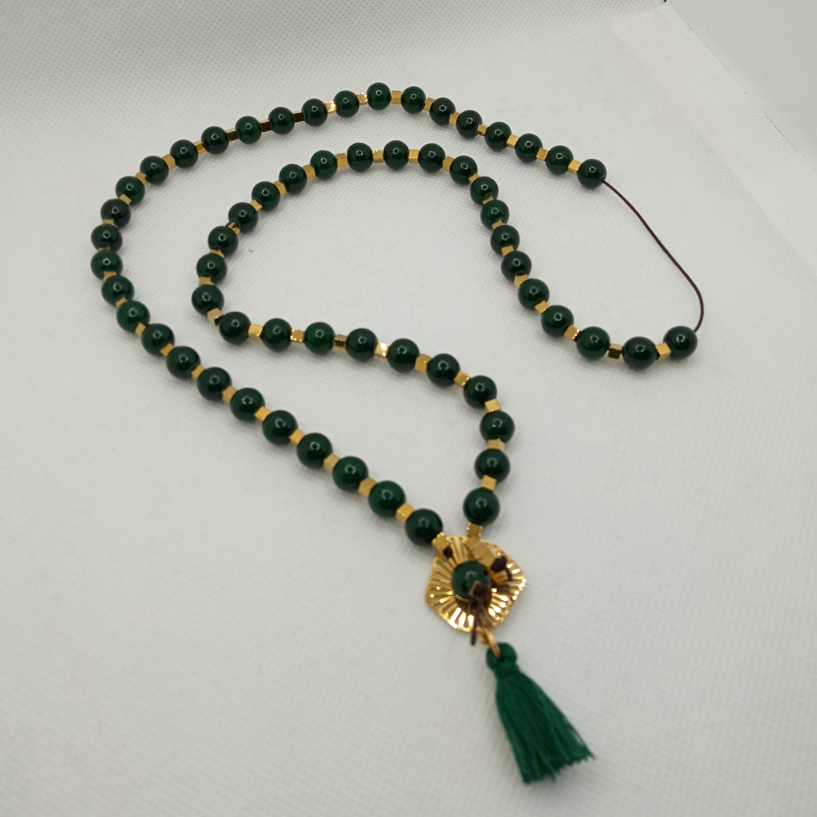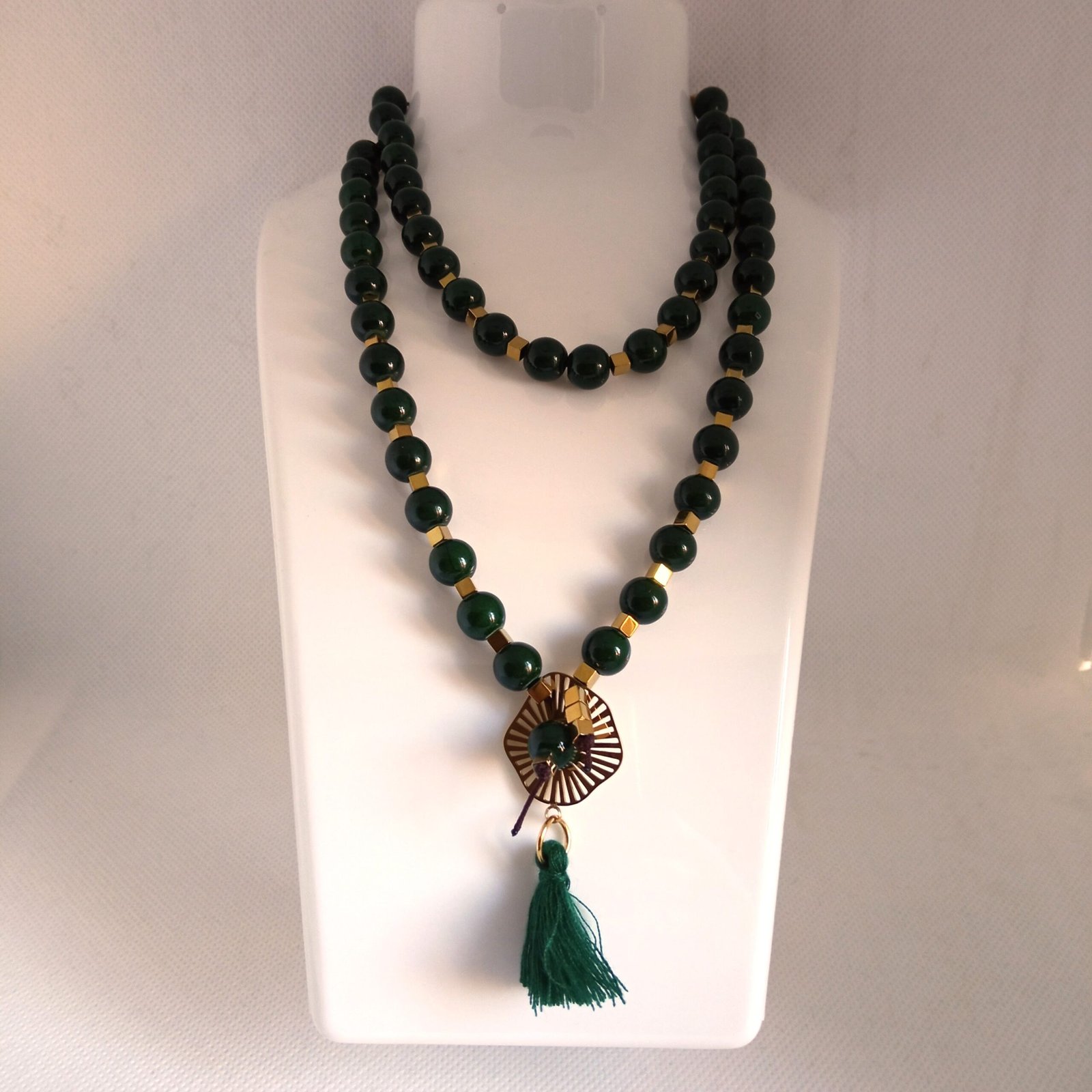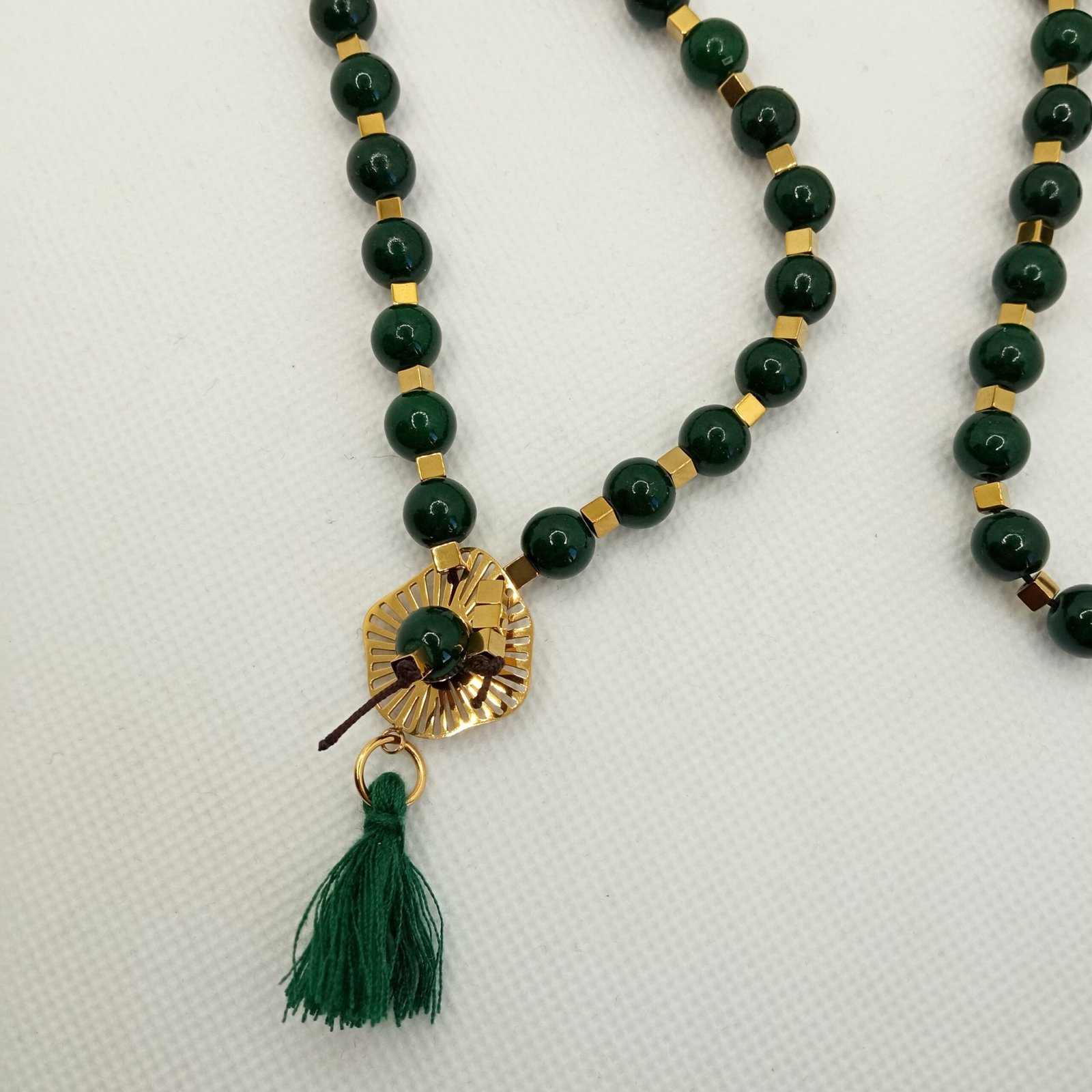 Το κολιέ ολοκληρώνεται με ένα χρυσαφί ατσάλινο ακτινωτό στοιχείο στο κέντρο και μια διακοσμητική φούντα στο ίδιο σκούρο πράσινο χρώμα με το χαολίτη, προσθέτοντας κίνηση και γοητεία στο σύνολο.