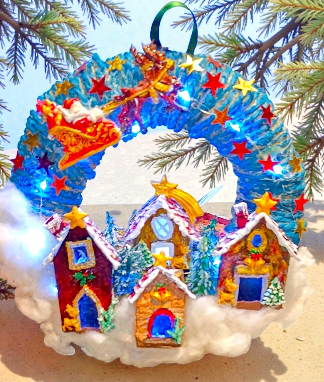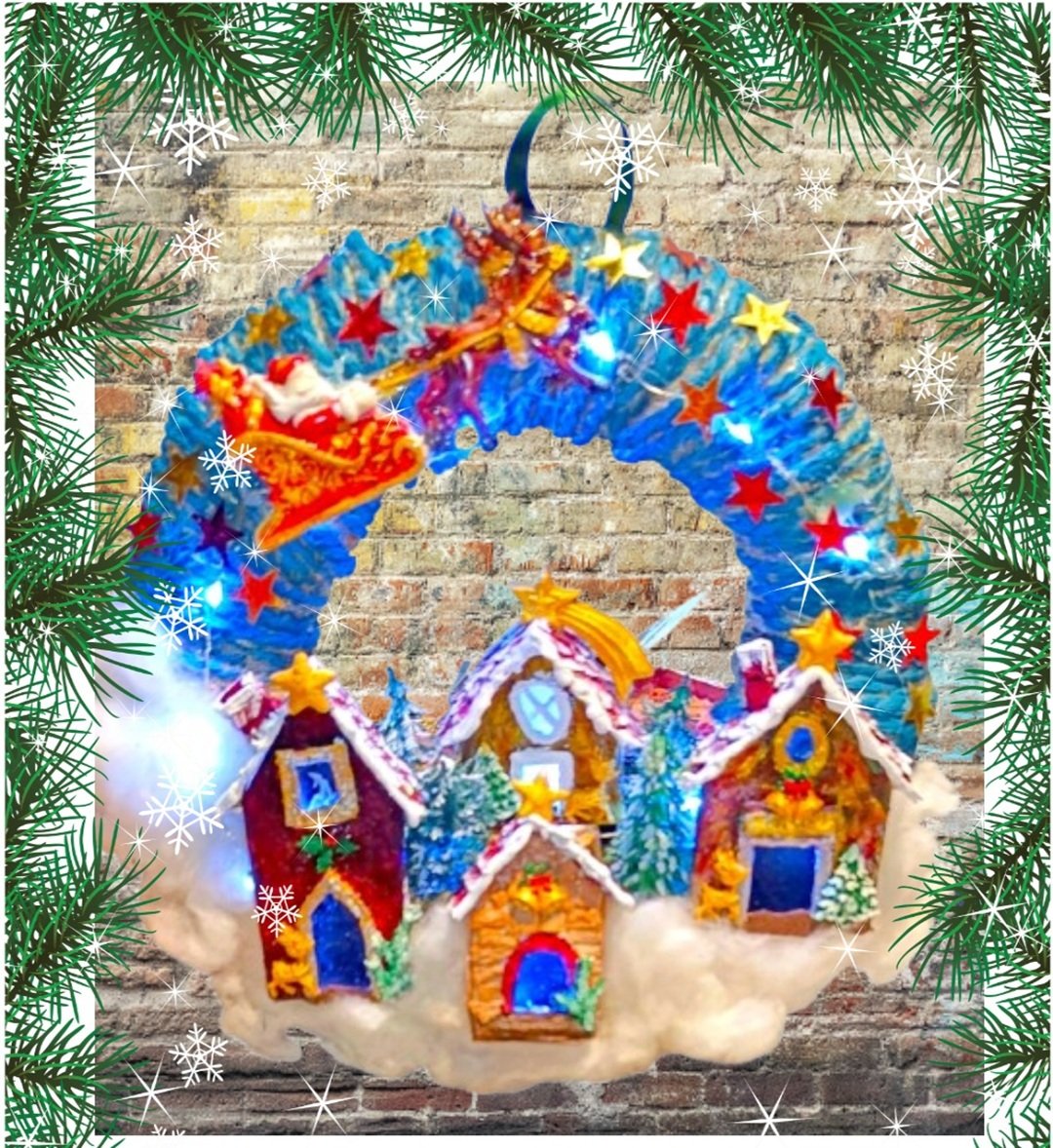 Χειροποιητο στεφανι -ο Αη Βασιλης με το ελκηθρο σε Χριστουγεννιατικο χωριο- φωτιζομενο με led
