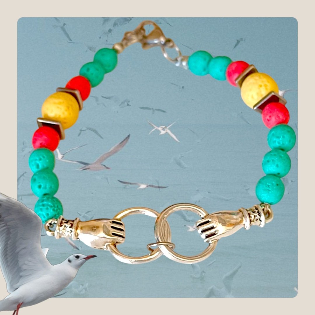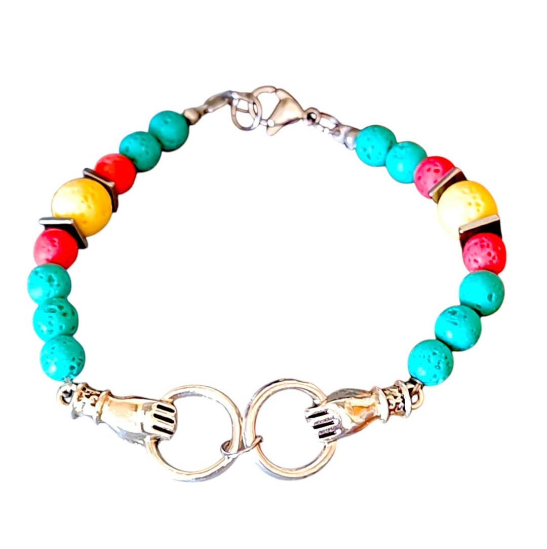 Χειροποιητο Βραχιολι με Ημιπολυτιμους λιθους Λαβα και Αιματιτη και ατσαλινα χερακια με κρικους