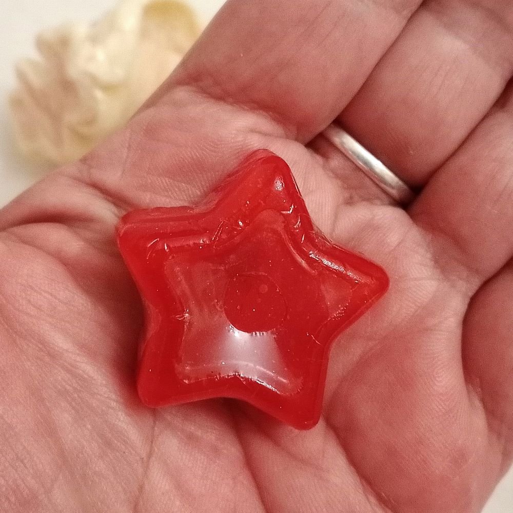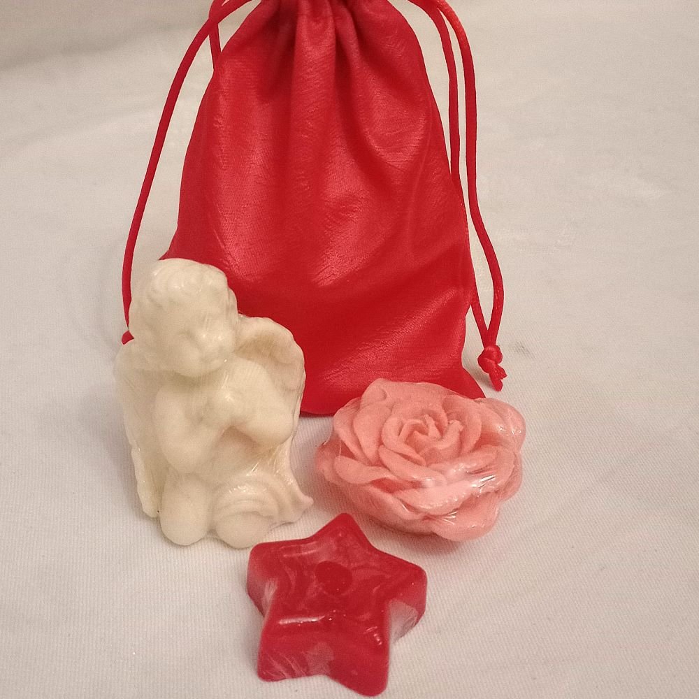 Κόκκινο σατέν πουγκάκι που περιέχει τρία χειροποίητα σαπουνάκια γλυκερίνης, μοσχομυρωδάτα και ευωδιαστά, για να μυρίσει όλο σας το σπίτι, Χριστούγεννα.