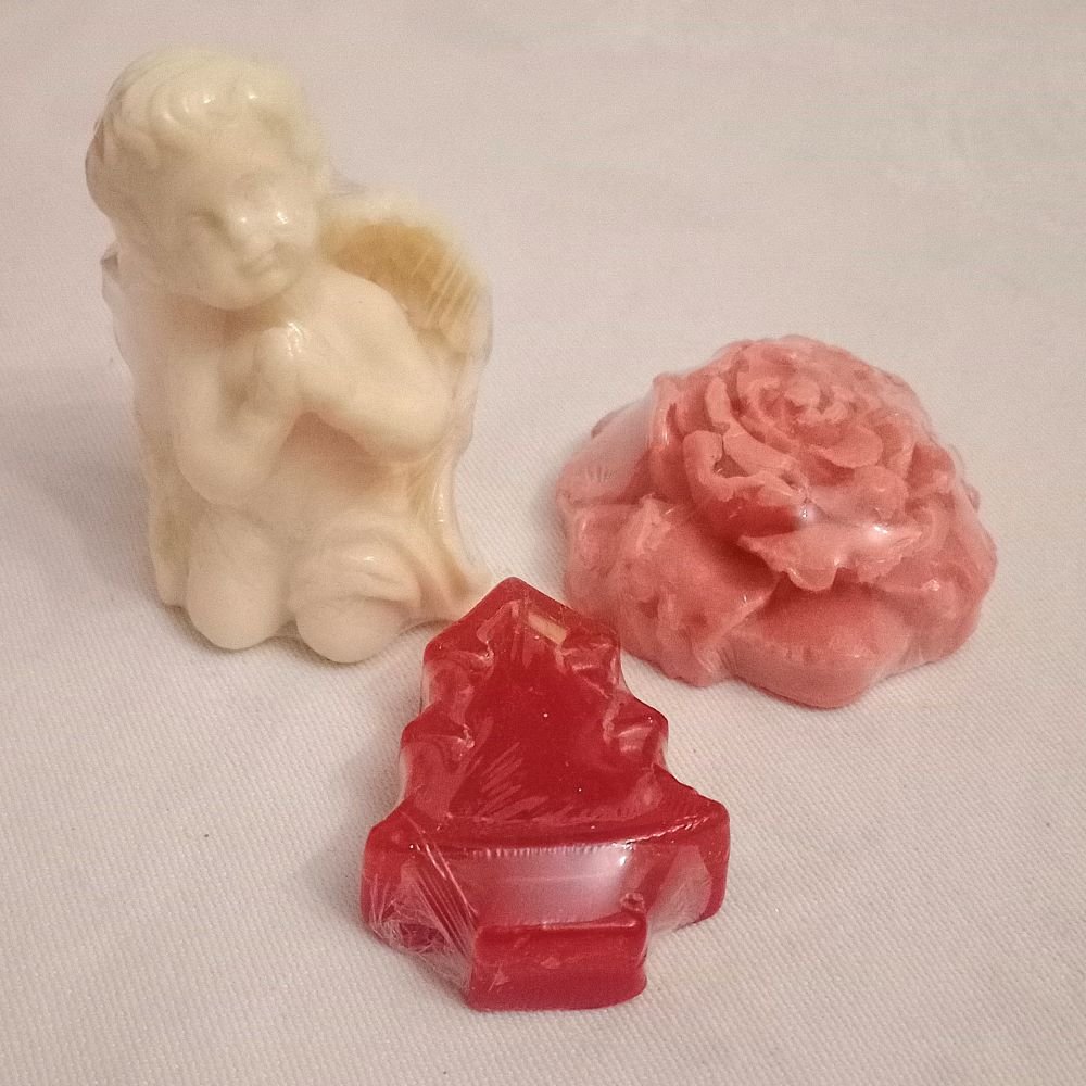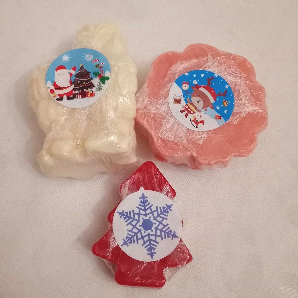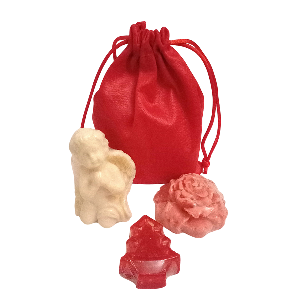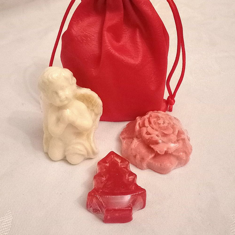 Κόκκινο σατέν πουγκάκι που περιέχει τρία χειροποίητα σαπουνάκια γλυκερίνης, μοσχομυρωδάτα και ευωδιαστά, για να μυρίσει όλο σας το σπίτι, Χριστούγεννα.