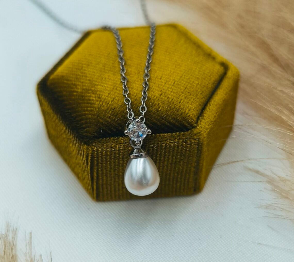 Το κολιέ είναι διακοσμημένο με πέρλα και κρύσταλλο, που αντανακλούν το φως με κάθε κίνηση, δημιουργώντας μια μαγευτική λάμψη.