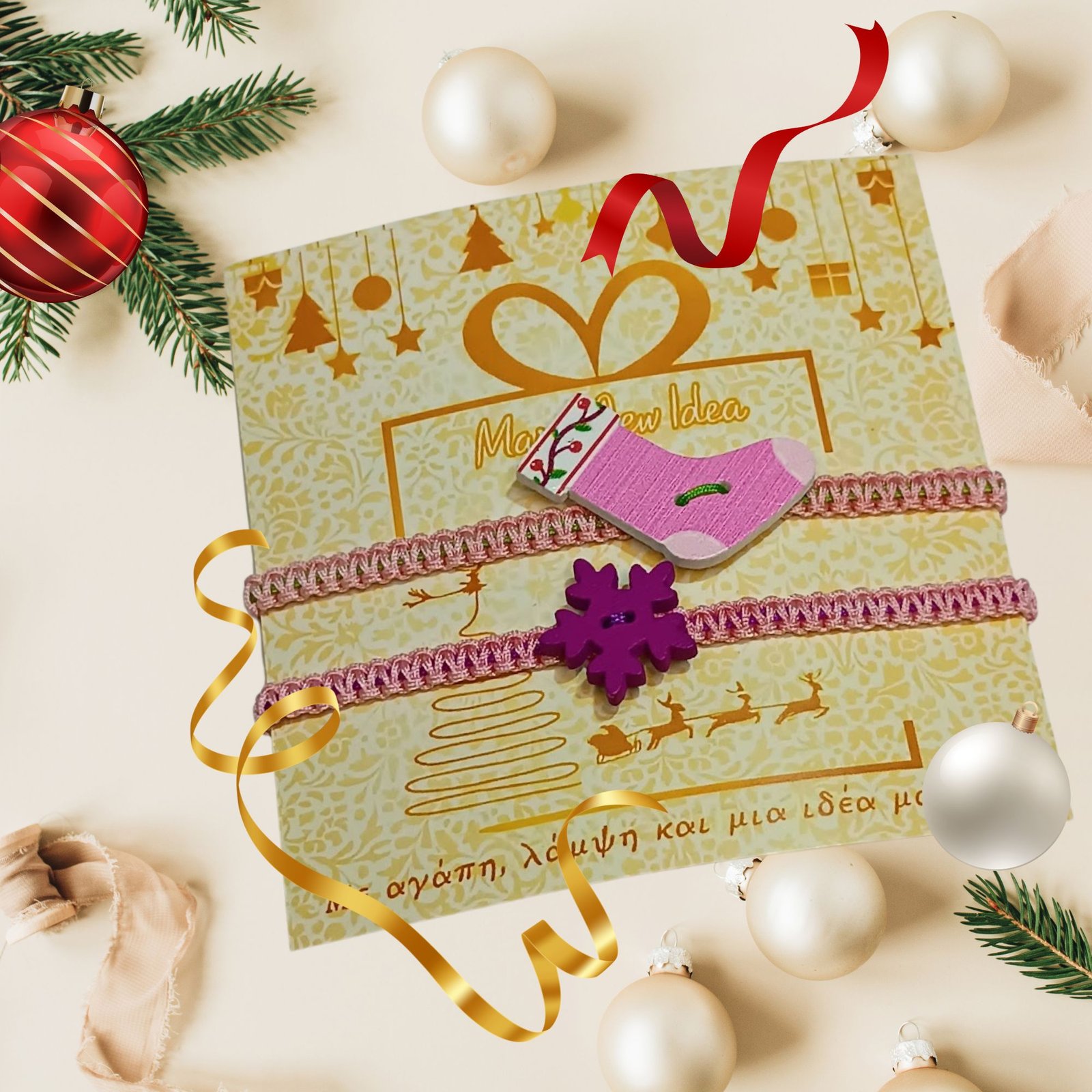 Το σετ περιλαμβάνει ένα βραχιόλι με χριστουγεννιάτικη μπότα και ένα με χιονονιφάδα, δεμένα με κορδόνι μακραμέ στις πιο χαριτωμένες αποχρώσεις.