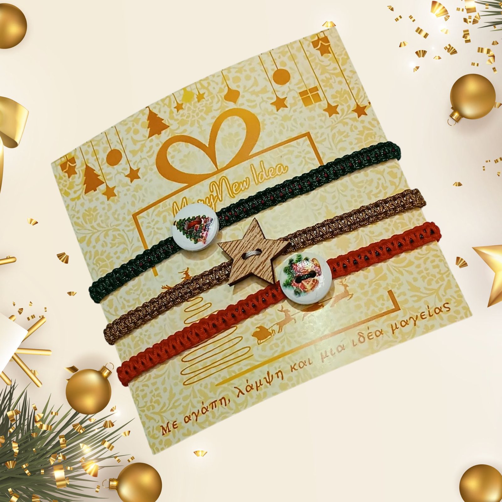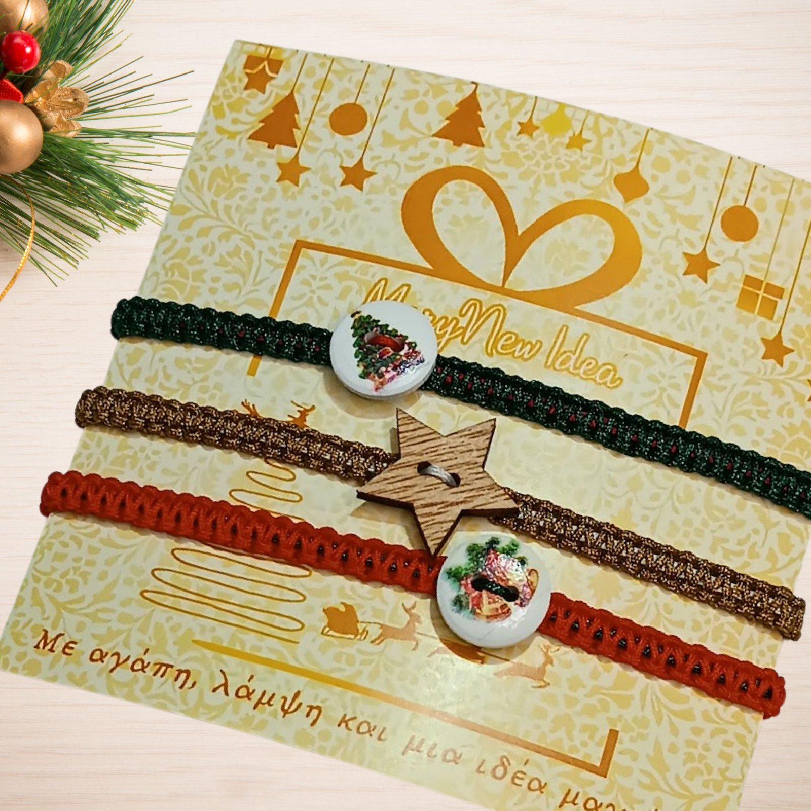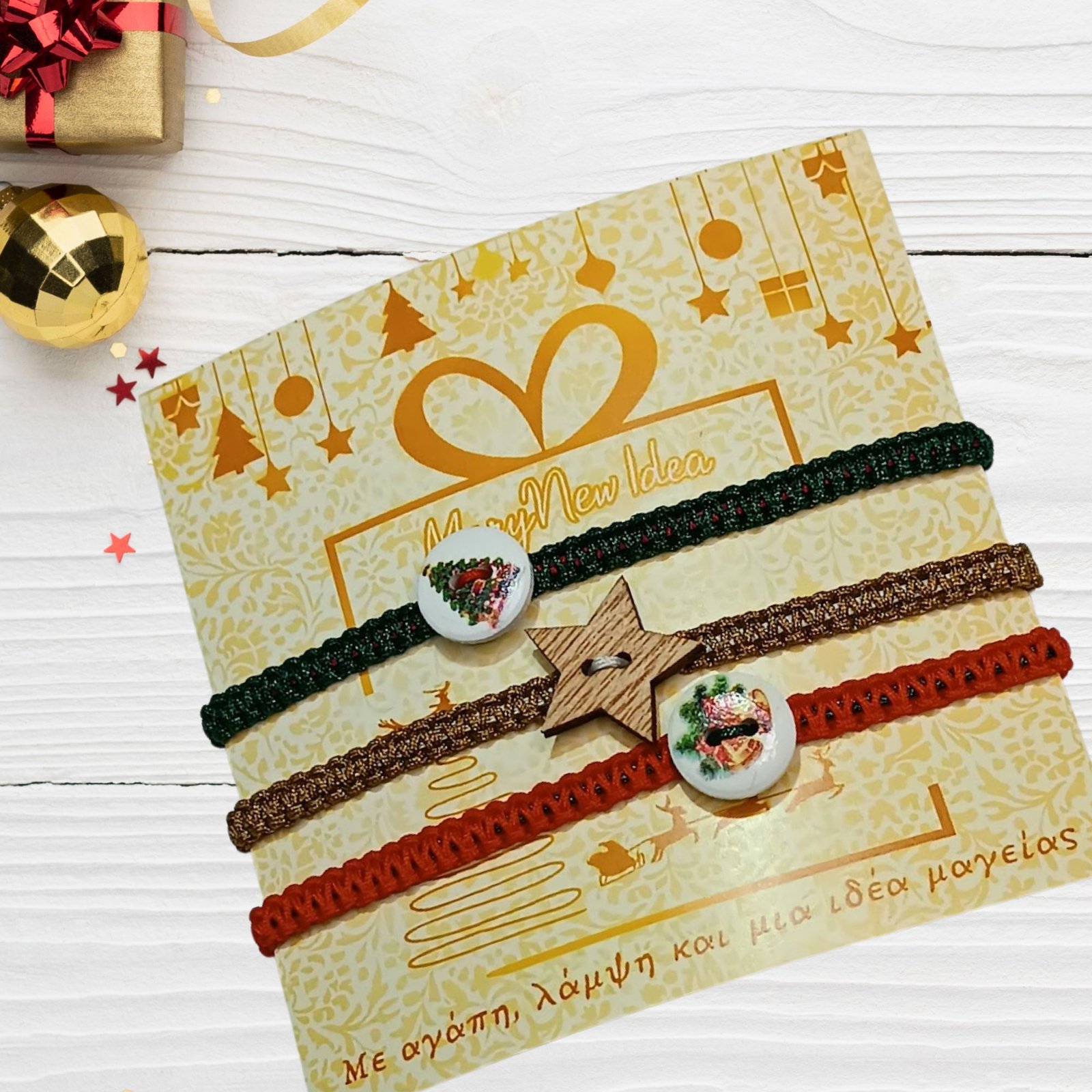 Κάθε βραχιόλι συνοδεύεται από χριστουγεννιάτικο διακοσμητικό στοιχείο (ξύλινο αστέρι ή εορταστικό κουμπάκι) και διαθέτει ρυθμιζόμενο κλείσιμο για άνετη εφαρμογή.