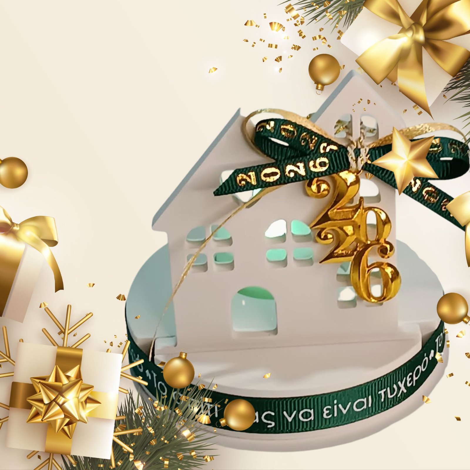 ✨Ένα ιδιαίτερο, χειροποίητο γούρι για το 2026, φτιαγμένο από σκόνη πορσελάνης και διακοσμημένο με κορδέλες & μεταλλικό στοιχείο 2026. Η βάση διαθέτει ενσωματωμένη θέση για ρεσό LED (περιλαμβάνεται), που αλλάζει απαλά χρώματα δημιουργώντας μια ζεστή, γιορτινή ατμόσφαιρα.