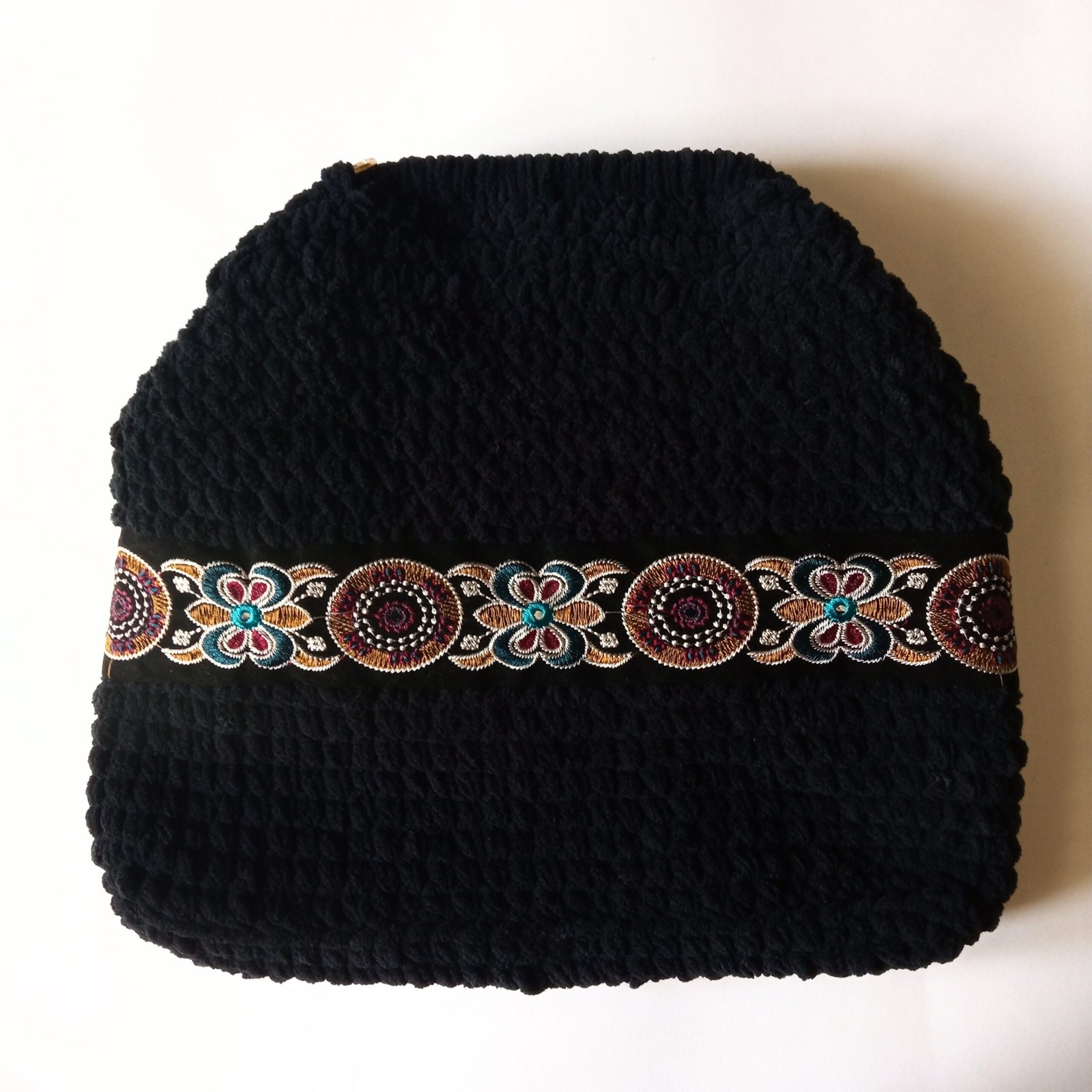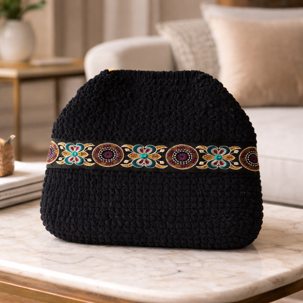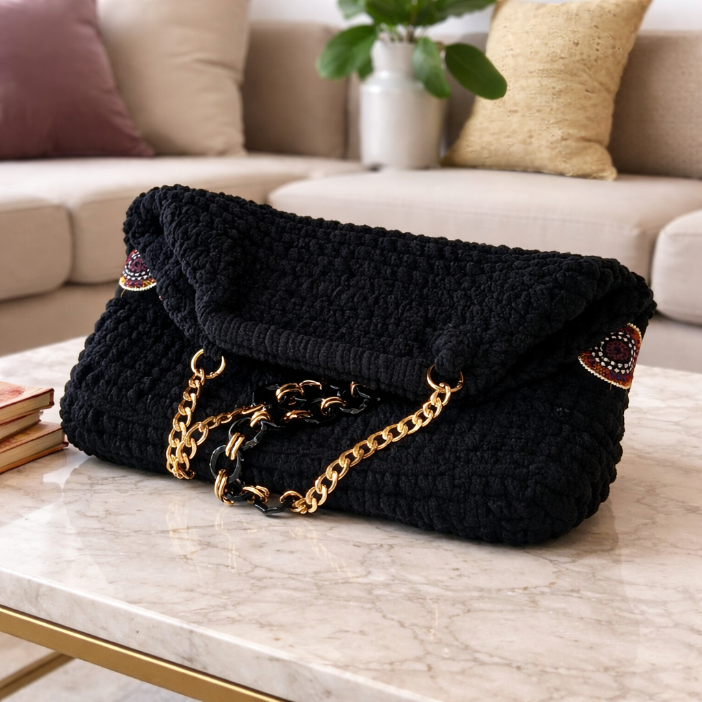 Γυναικεία χειροποίητη πλεκτή τσάντα ώμου και χειρός, φτιαγμένη με απαλό βελουτέ νήμα σε μαύρο χρώμα, που χαρίζει πλούσια υφή και κομψή εμφάνιση. Η διακοσμητική τρέσα προσθέτει χαρακτήρα και ξεχωριστό στυλ, ενώ η αλυσίδα της σε χρυσαφί χρώμα με μαύρους κρίκους αναβαθμίζει το αποτέλεσμα με μια διακριτική πολυτέλεια.