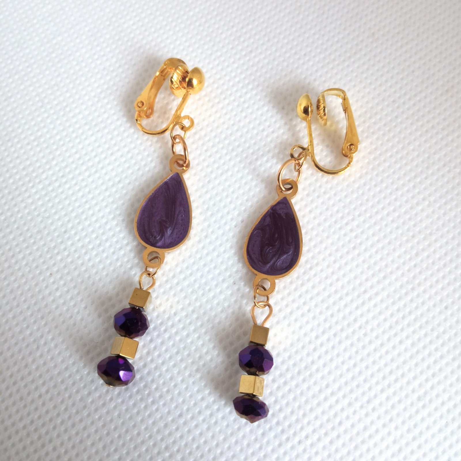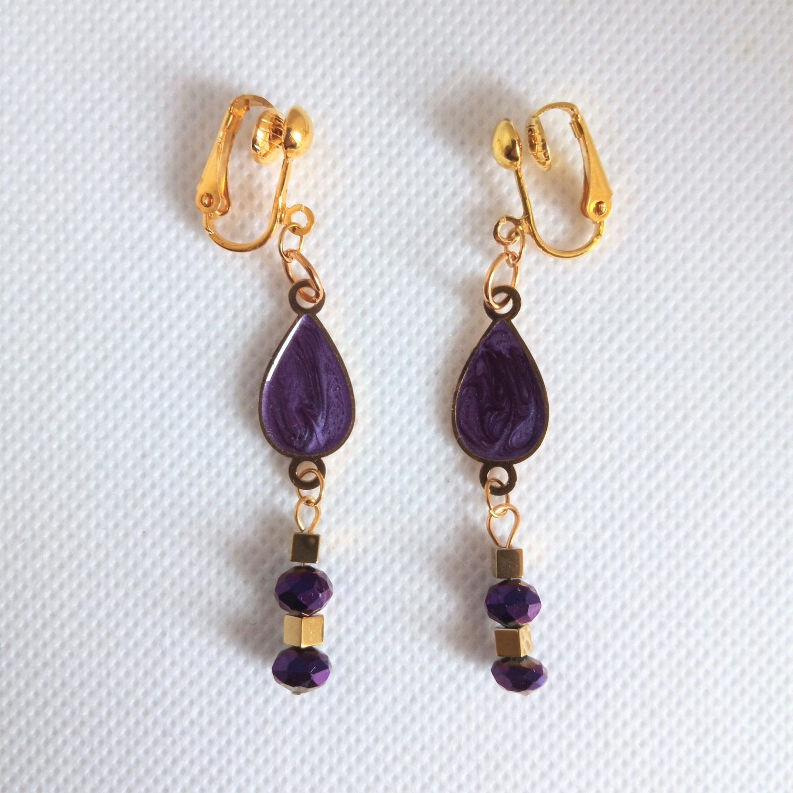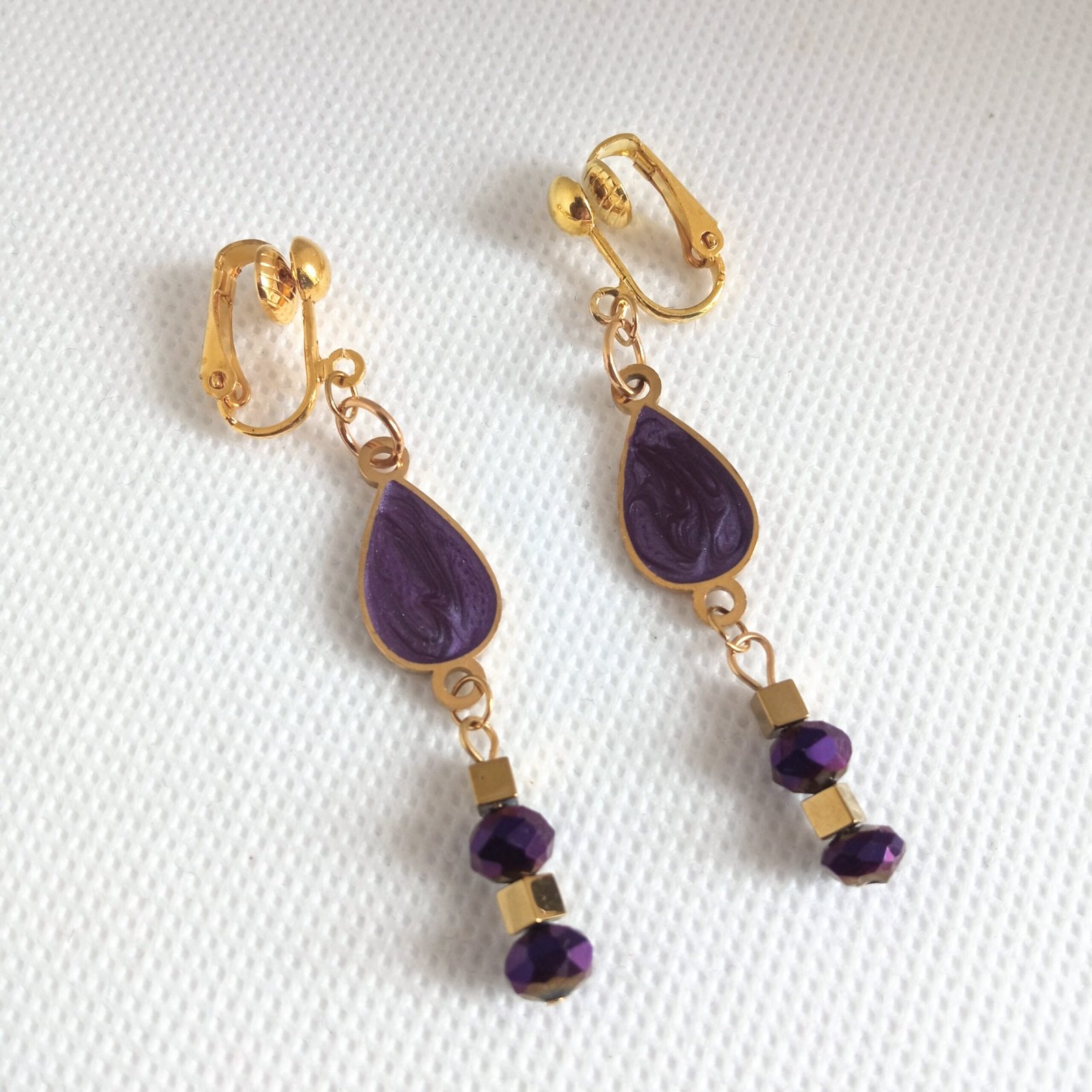 Χειροποίητα κρεμαστά σκουλαρίκια με κλιπ σε χρυσαφί χρώμα, με ατσάλινο δάκρυ με μωβ σμάλτο σε βαθύ σκούρο μωβ χρώμα, κρύσταλλα σε βαθύ μωβ χρώμα και χρυσούς αιματίτες.
