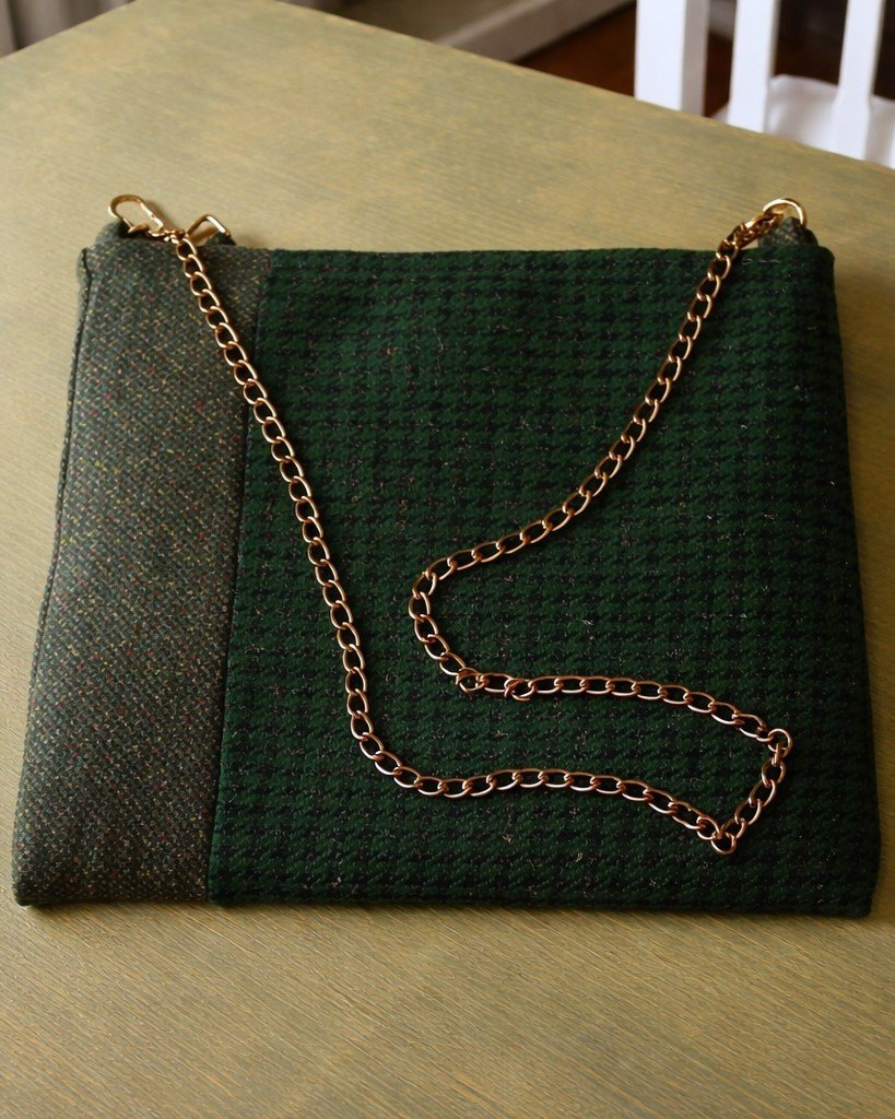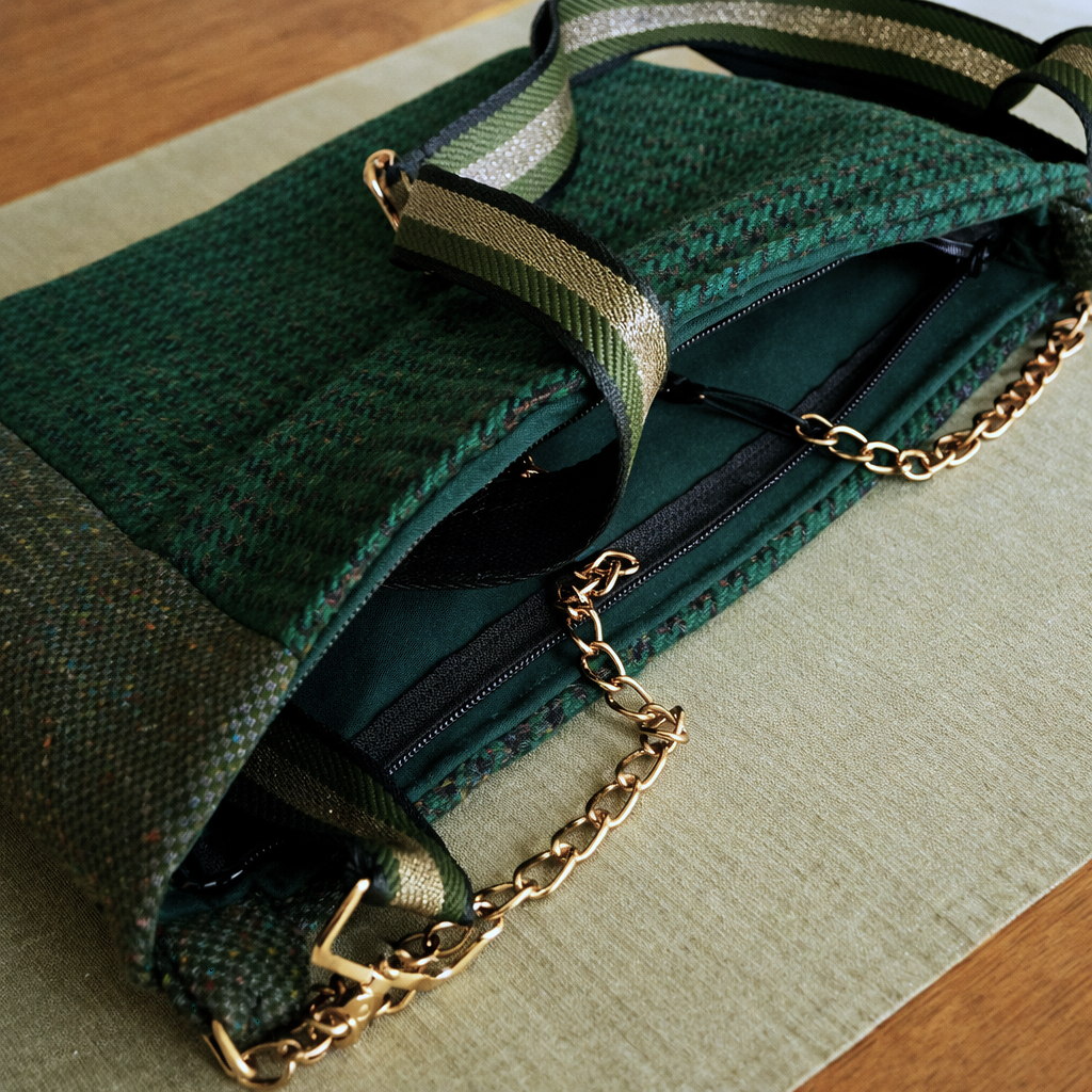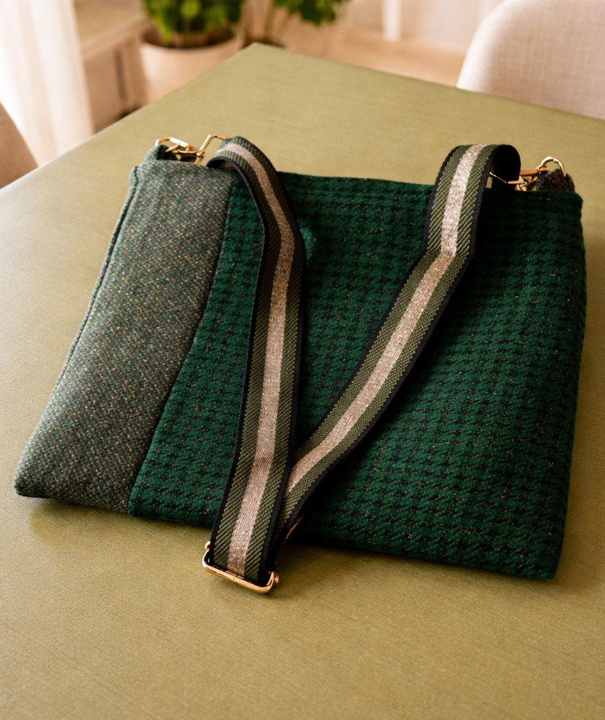 Γυναικεία τσάντα ώμου και χιαστί, χειροποίητη, από ύφασμα τουίντ Pied de Poule σε αποχρώσεις του πράσινου με μαύρο και πράσινο με χρωματιστές διακριτικές λεπτομέρειες.