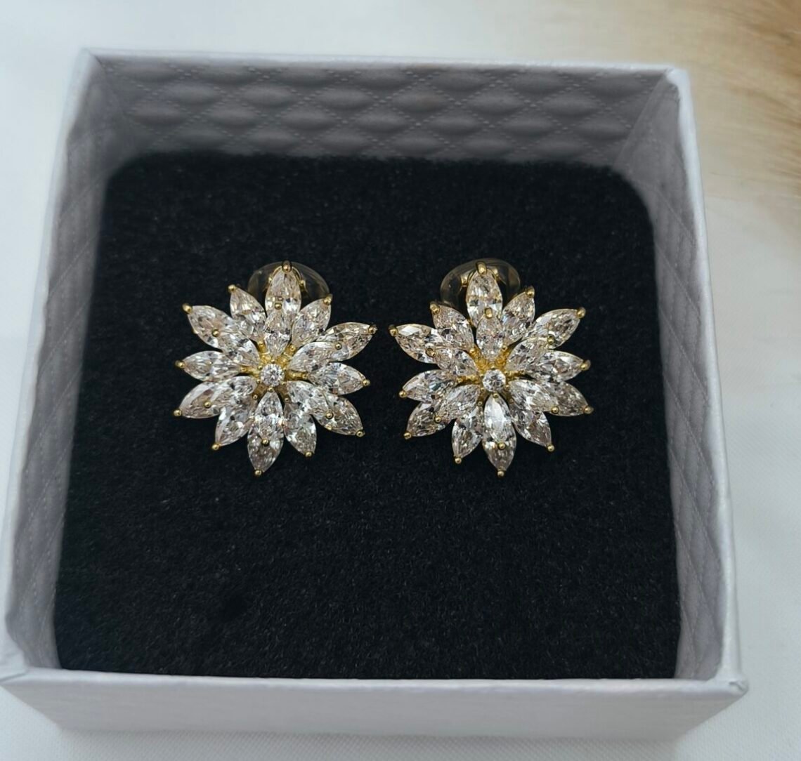 Σκουλαρίκια νυφικά χρυσά από επιπλατινωμένο κράμα ατσάλι , υπό αλλεργικά με λαμπερά κρύσταλλα .Κομψά σκουλαρίκια με λαμπερά κρύσταλλα , ιδανικά για κάθε περίσταση.