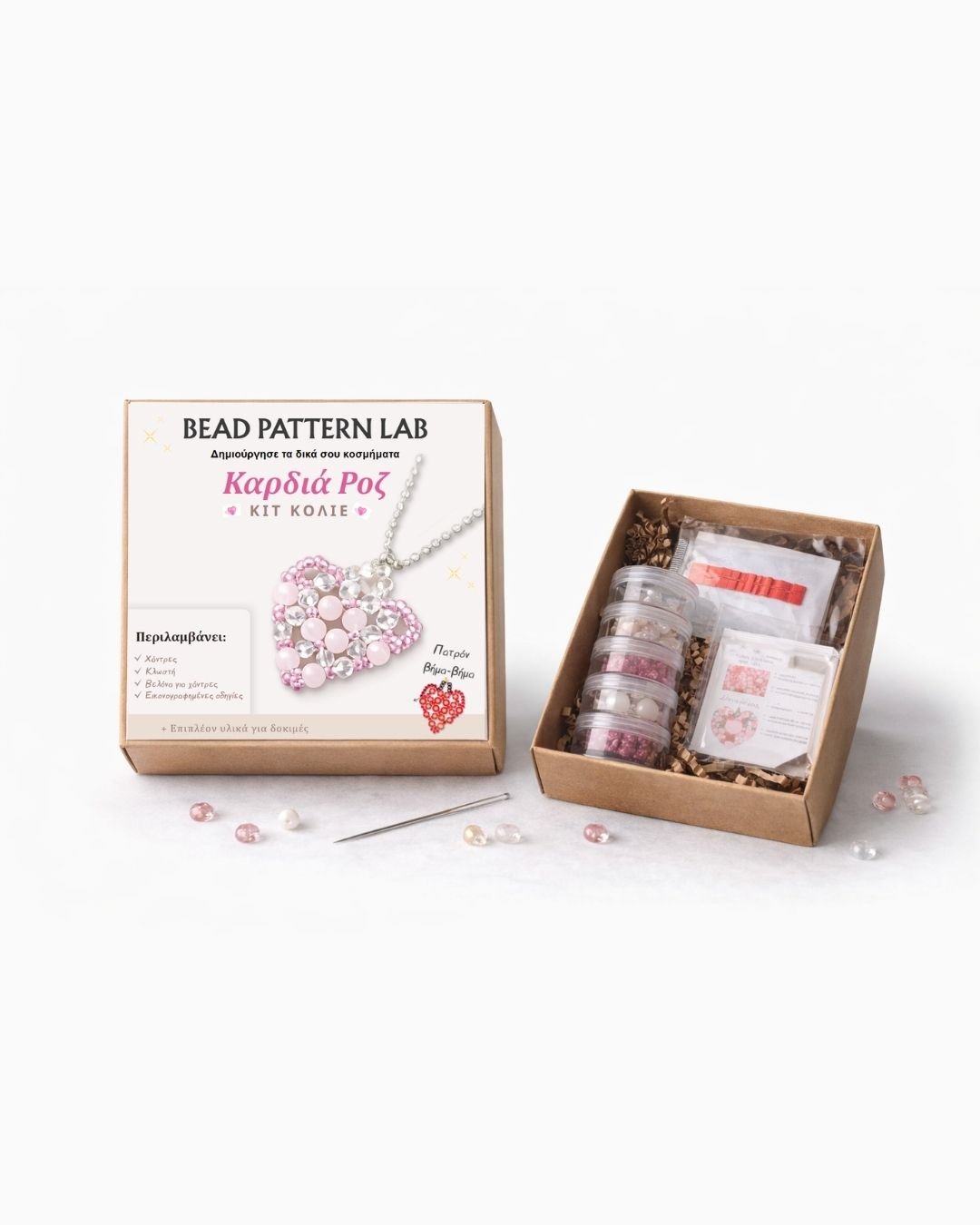 Το kit περιλαμβάνει όλα τα απαραίτητα υλικά και εικονογραφημένες οδηγίες για να φτιάξεις ένα μοναδικό κολιέ σε σχήμα καρδιάς.