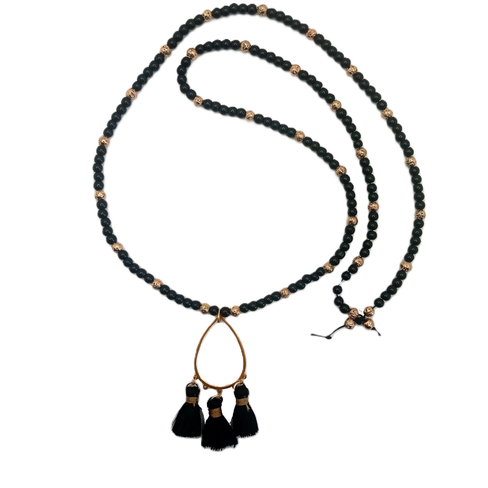 Στο κάτω μέρος στοιχείο δάκρυ από ατσάλι σε χρυσαφί χρώμα, ολοκληρώνεται με τρεις μαύρες φούντες που χαρίζουν μοντέρνο και μποέμ χαρακτήρα.