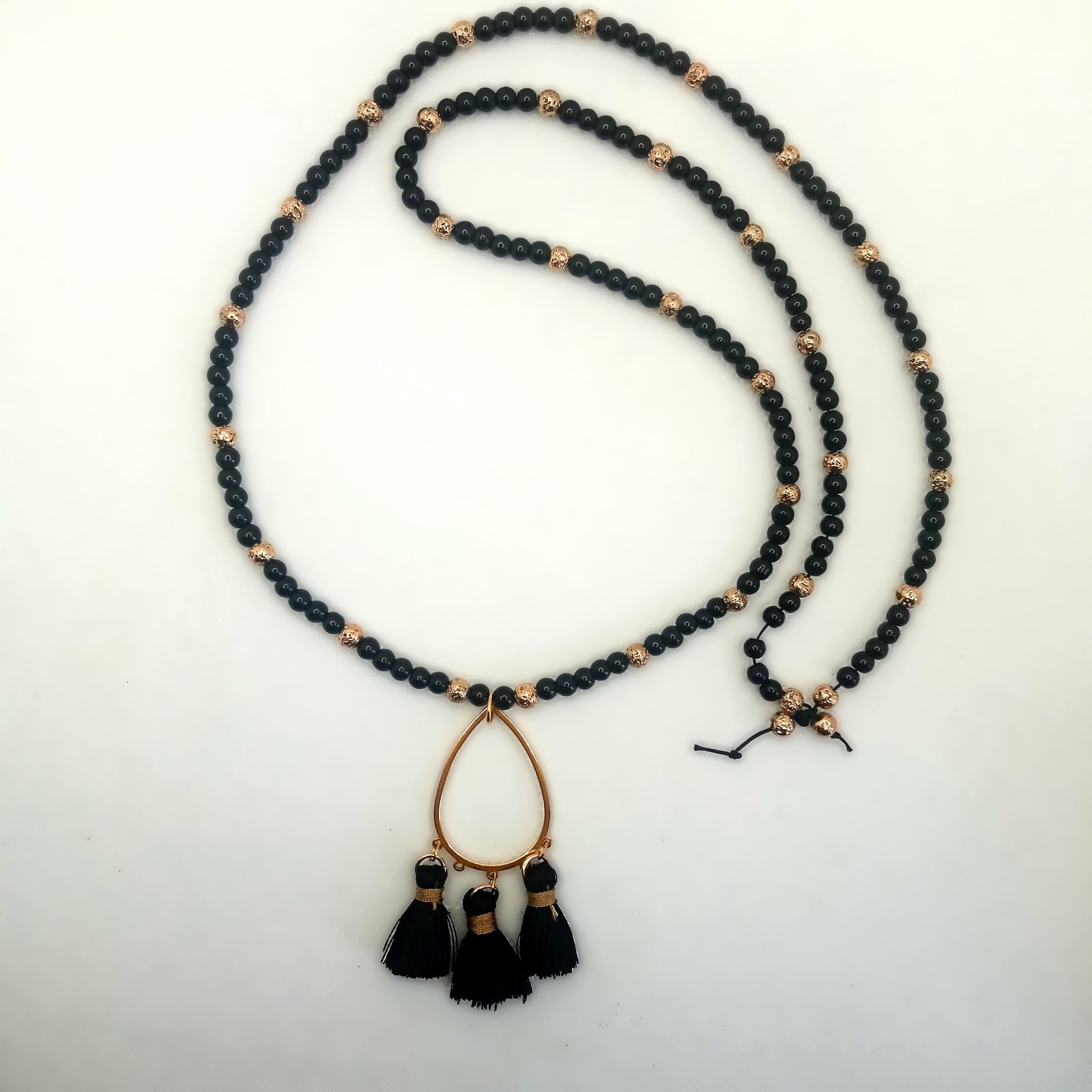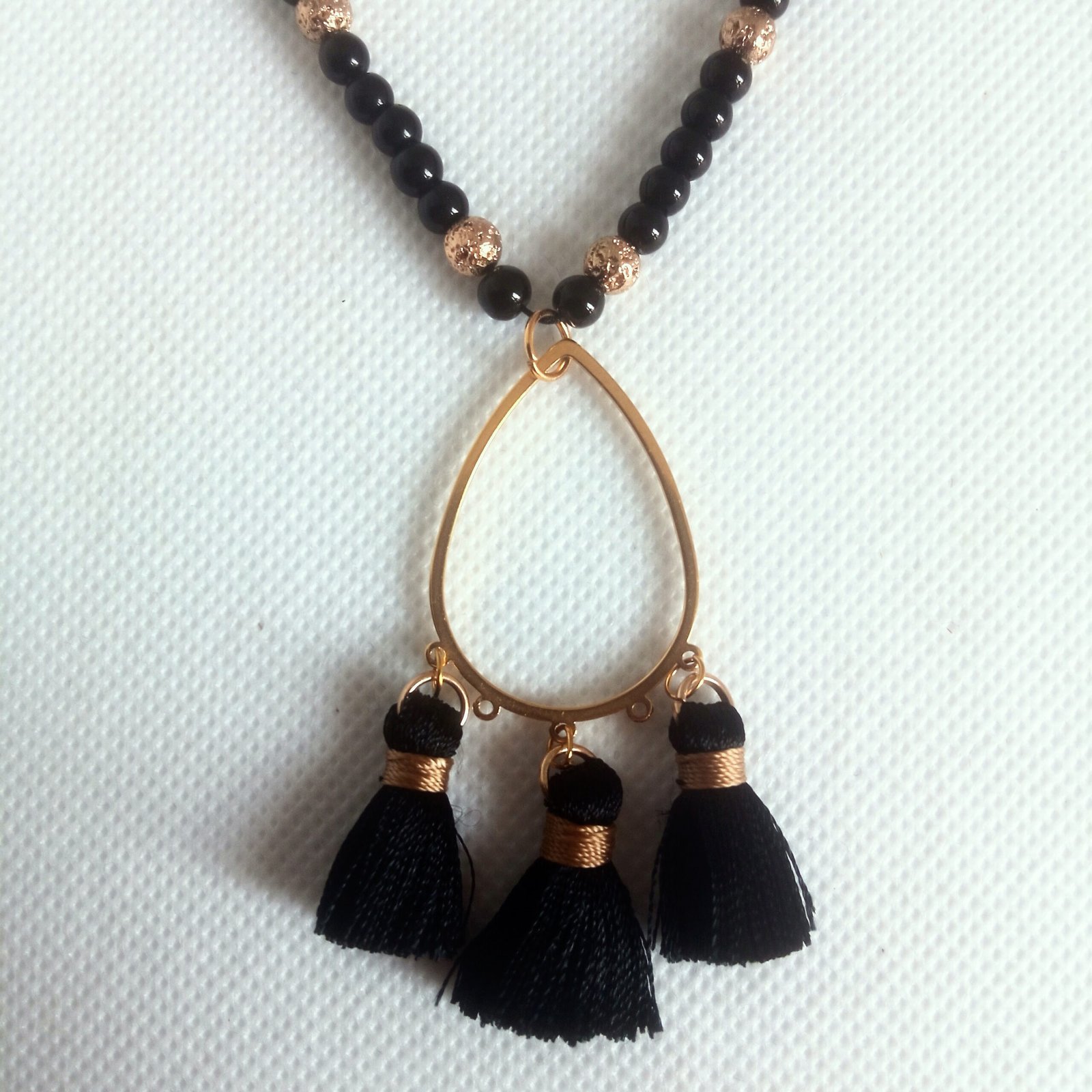 Χειροποίητο κολιέ με ημιπολύτιμους λίθους λάβας σε χρυσαφί τόνους και κομψές μαύρες χάντρες από γυαλί.