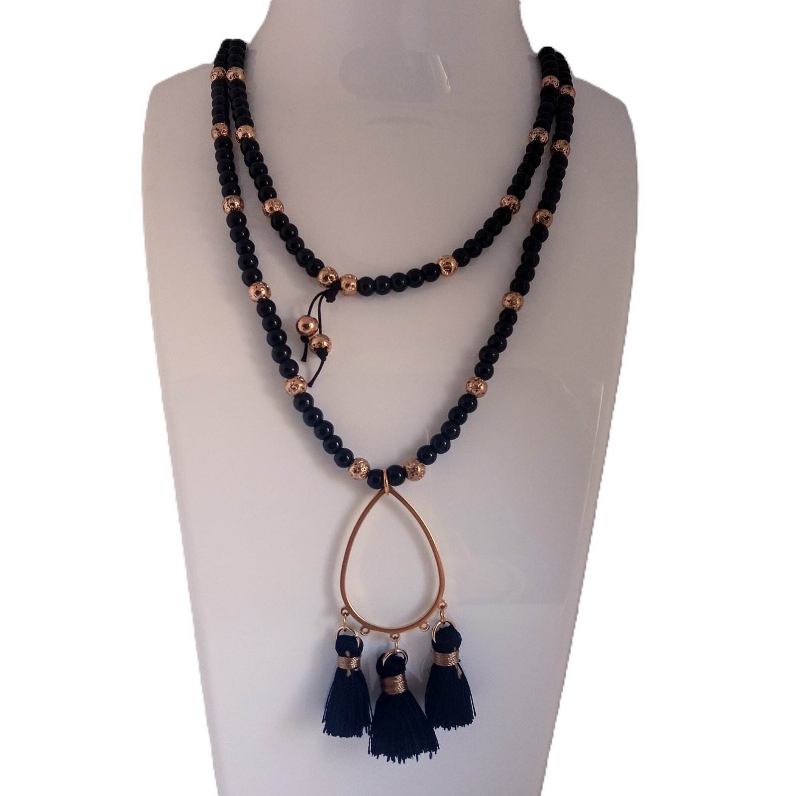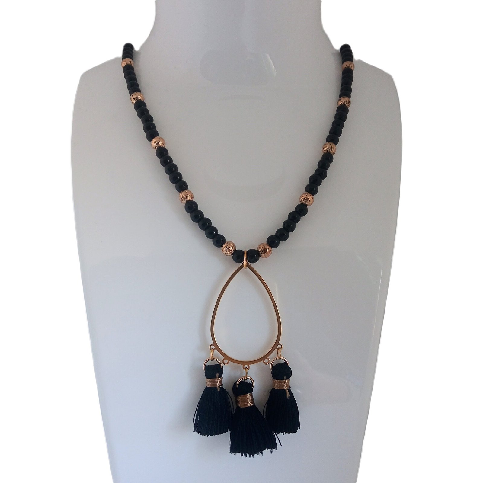 Εντυπωσιακό χειροποίητο κολιέ με ημιπολύτιμους λίθους λάβας σε χρυσαφί τόνους και κομψές μαύρες χάντρες από γυαλί.