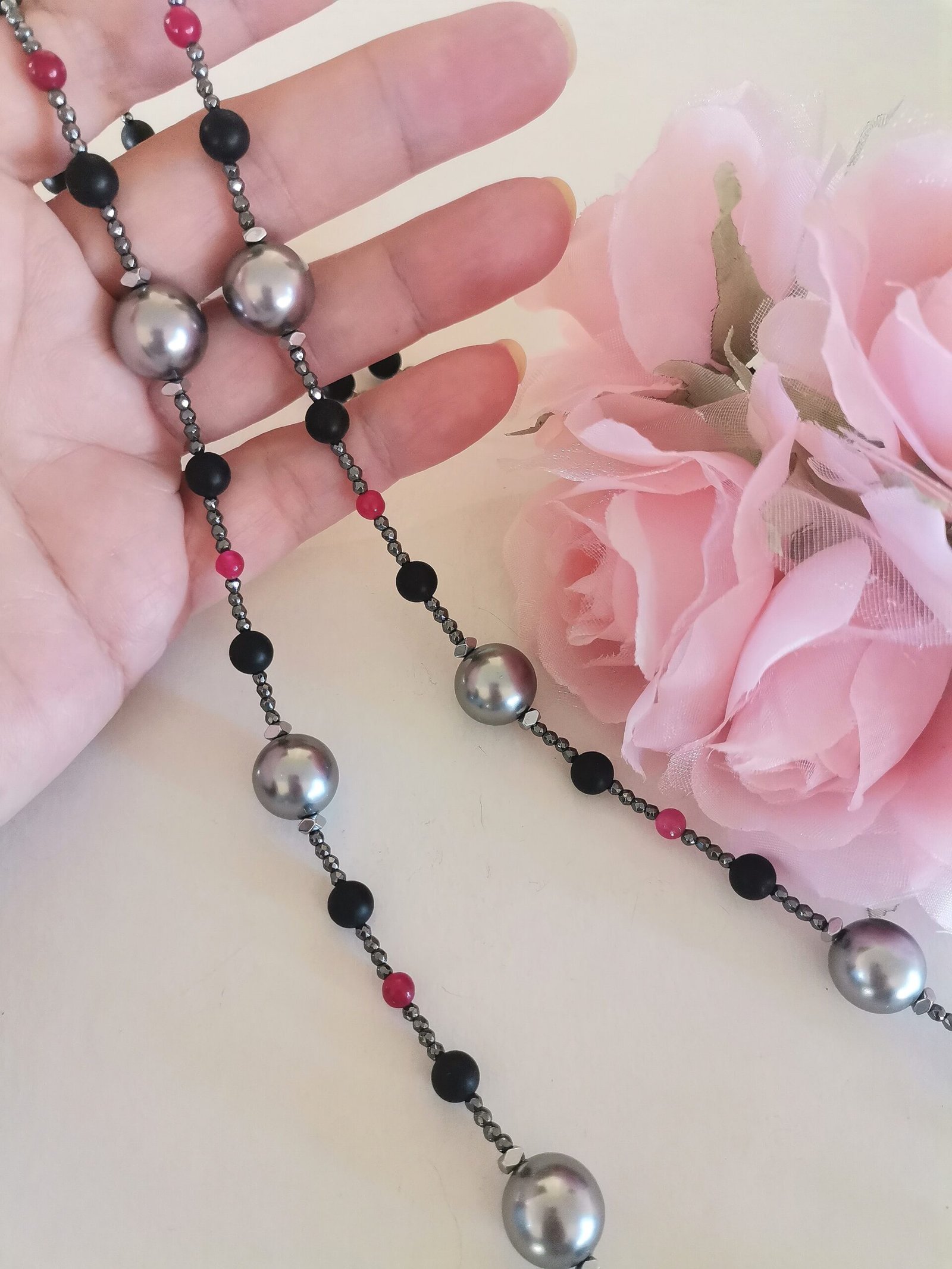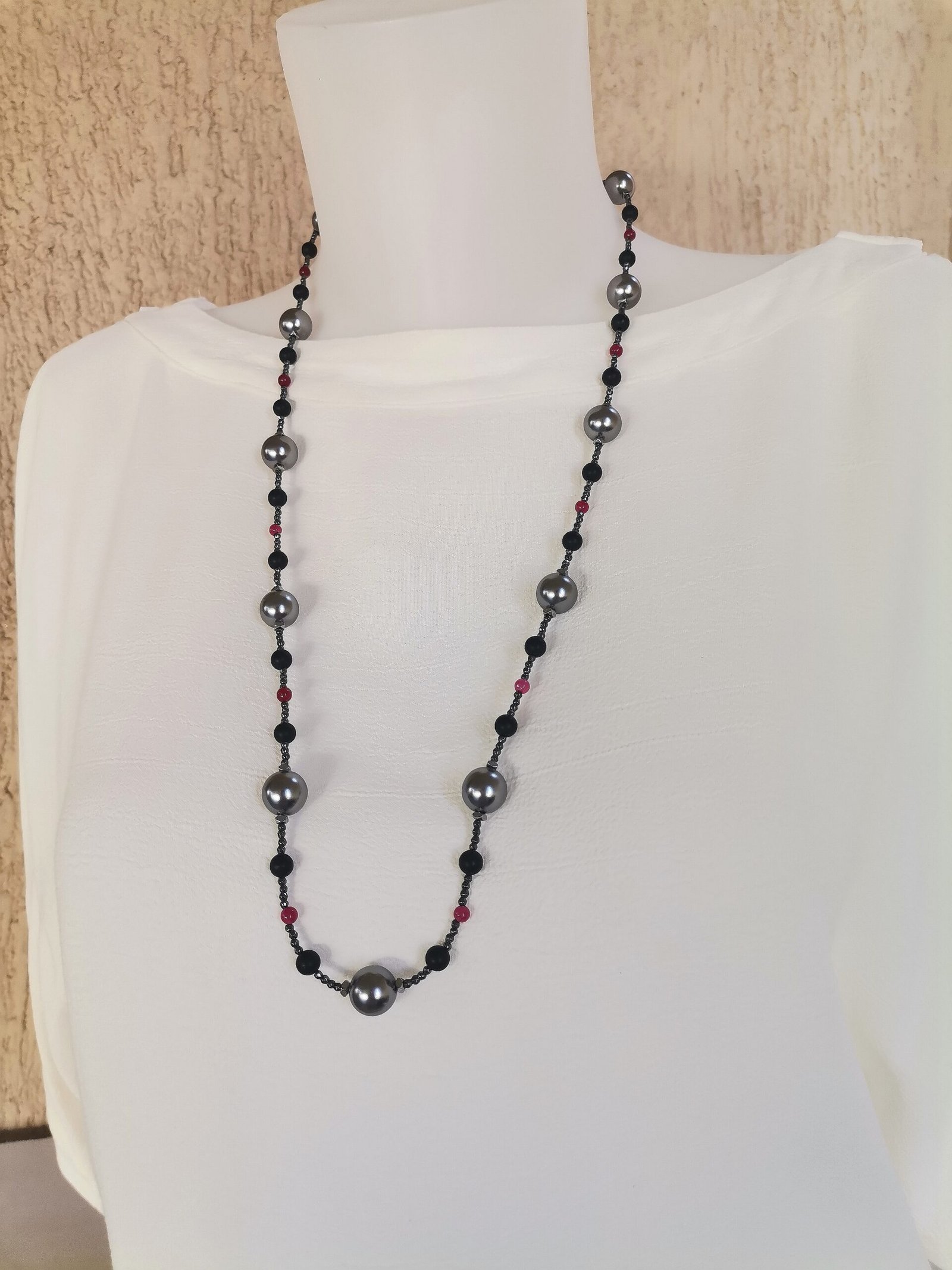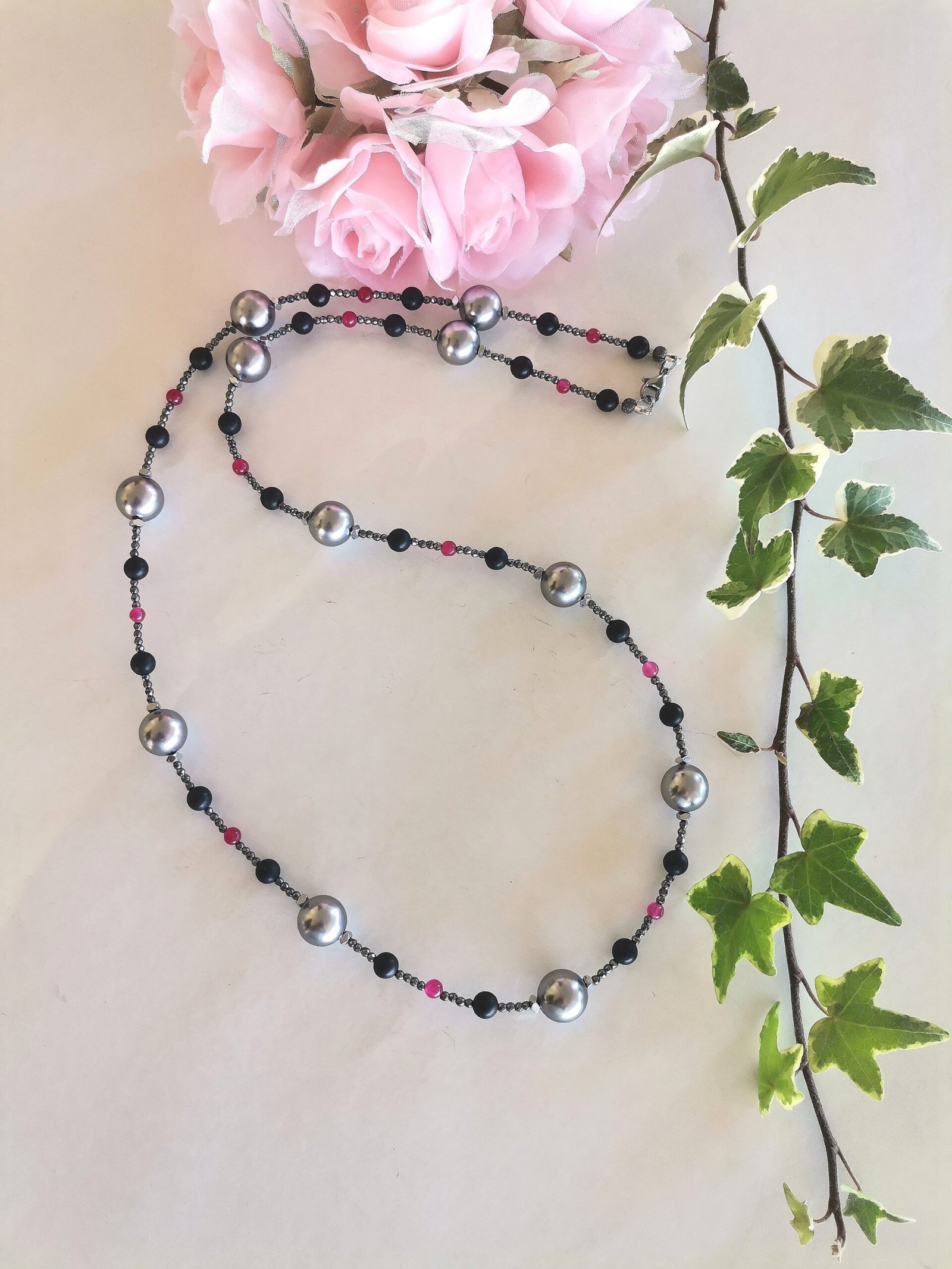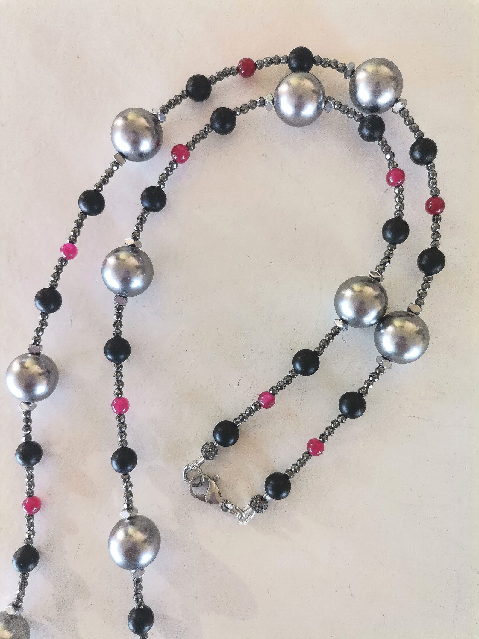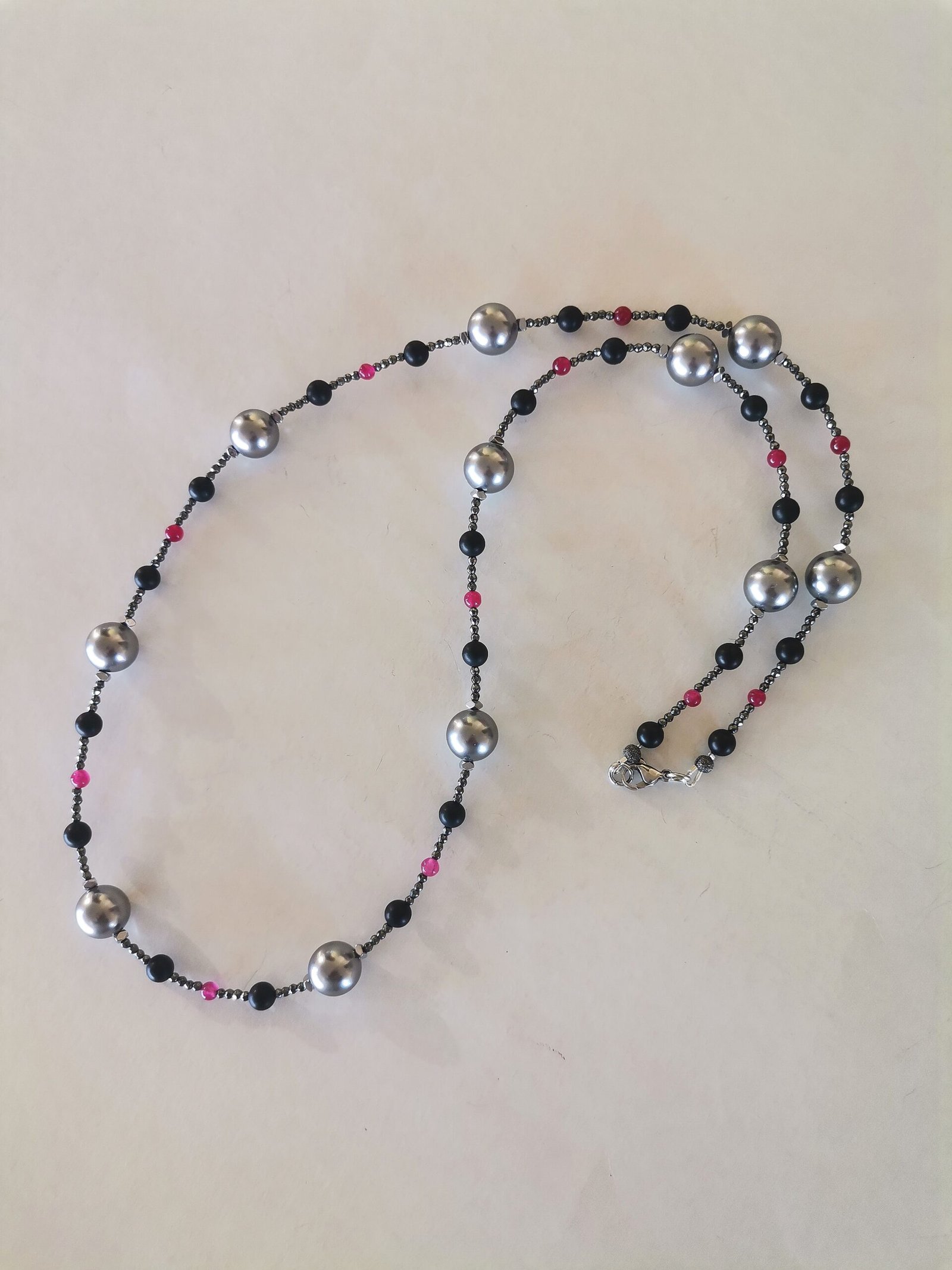 Κλασσικό, λαμπερό κολιέ με γκρι όστρακο (shell pearl) 12mm, μαύρο όνυχα mat 6mm, κόκκινο jade 4mm, ανθρακί αιματίτες ταγιέ 2mm, ασημί αιματίτες ταγιέ και ατσάλινο κούμπωμα.