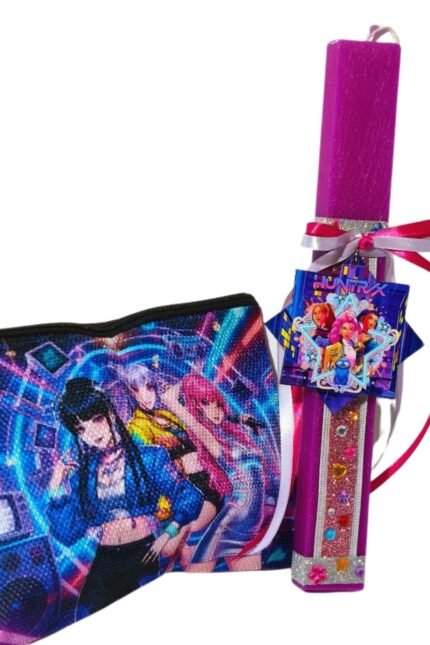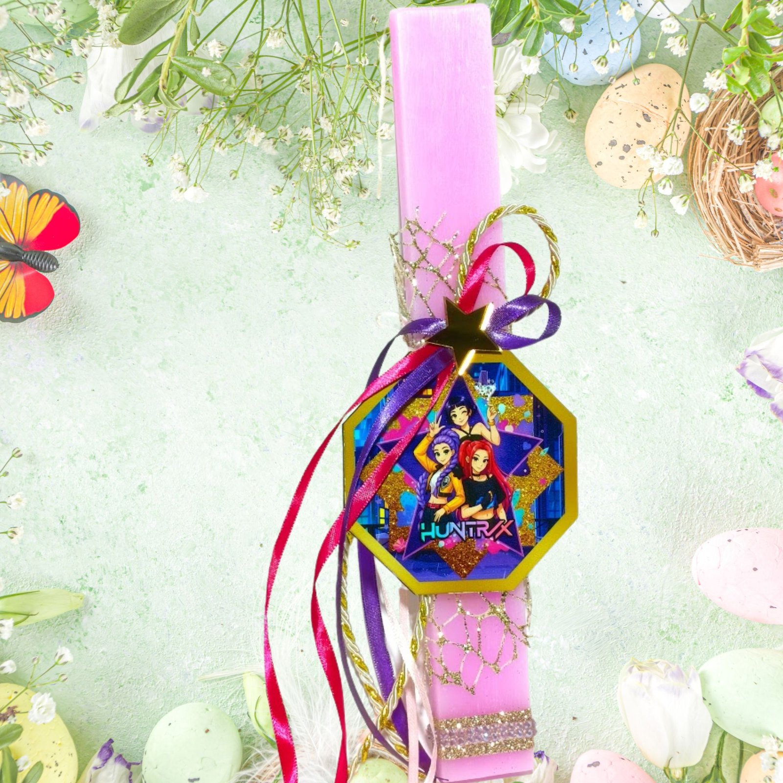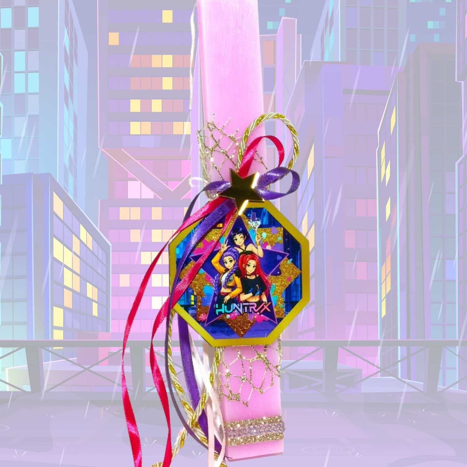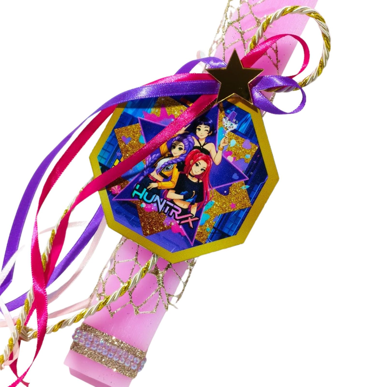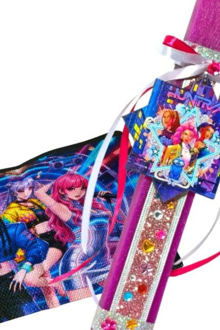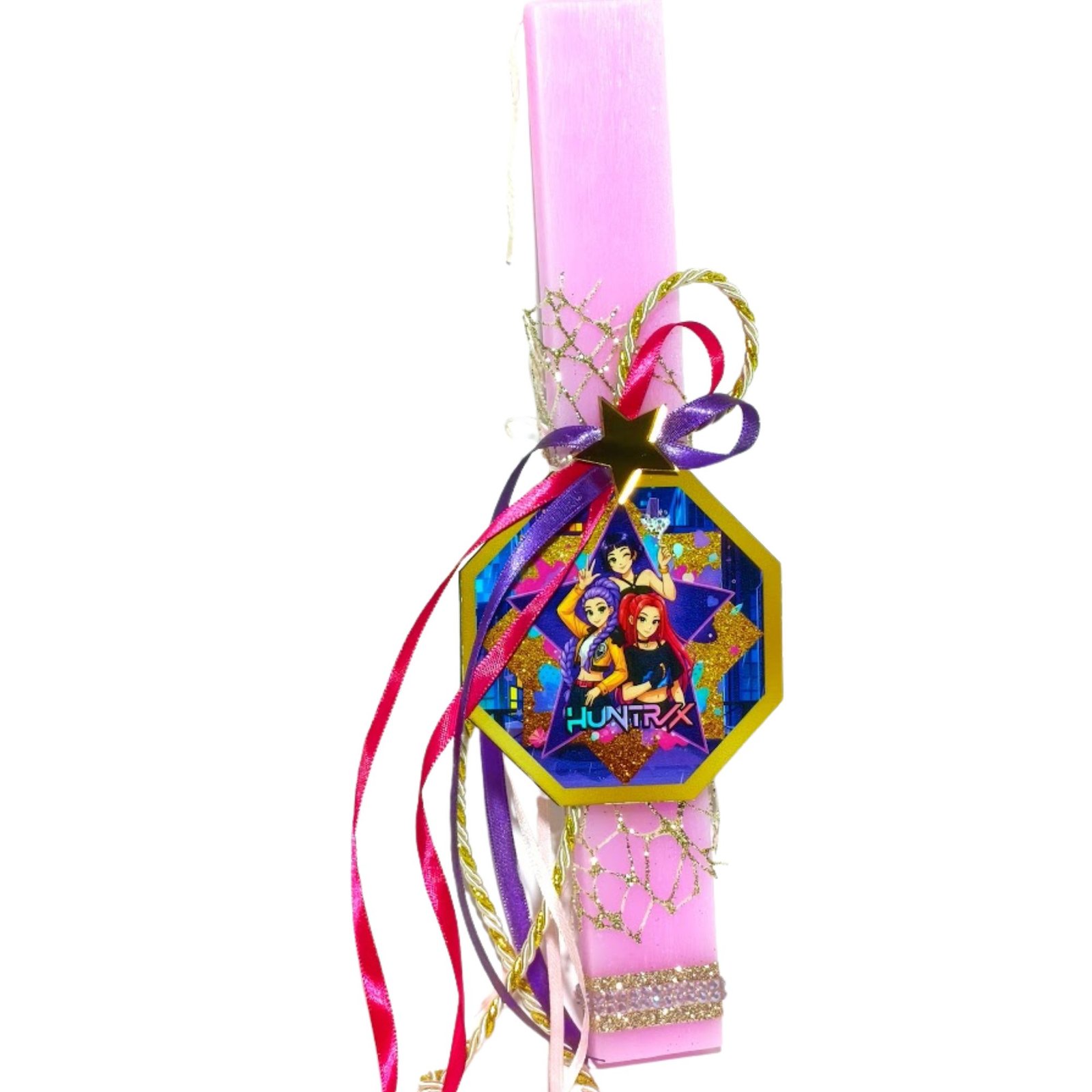 Χειροποίητη Πασχαλινή λαμπάδα αρωματική ροζ, εμπνευσμένη από την K-Pop μουσική σκηνή, με έντονες φούξια, μοβ, ροζ και χρυσές αποχρώσεις με glitter διακόσμηση.