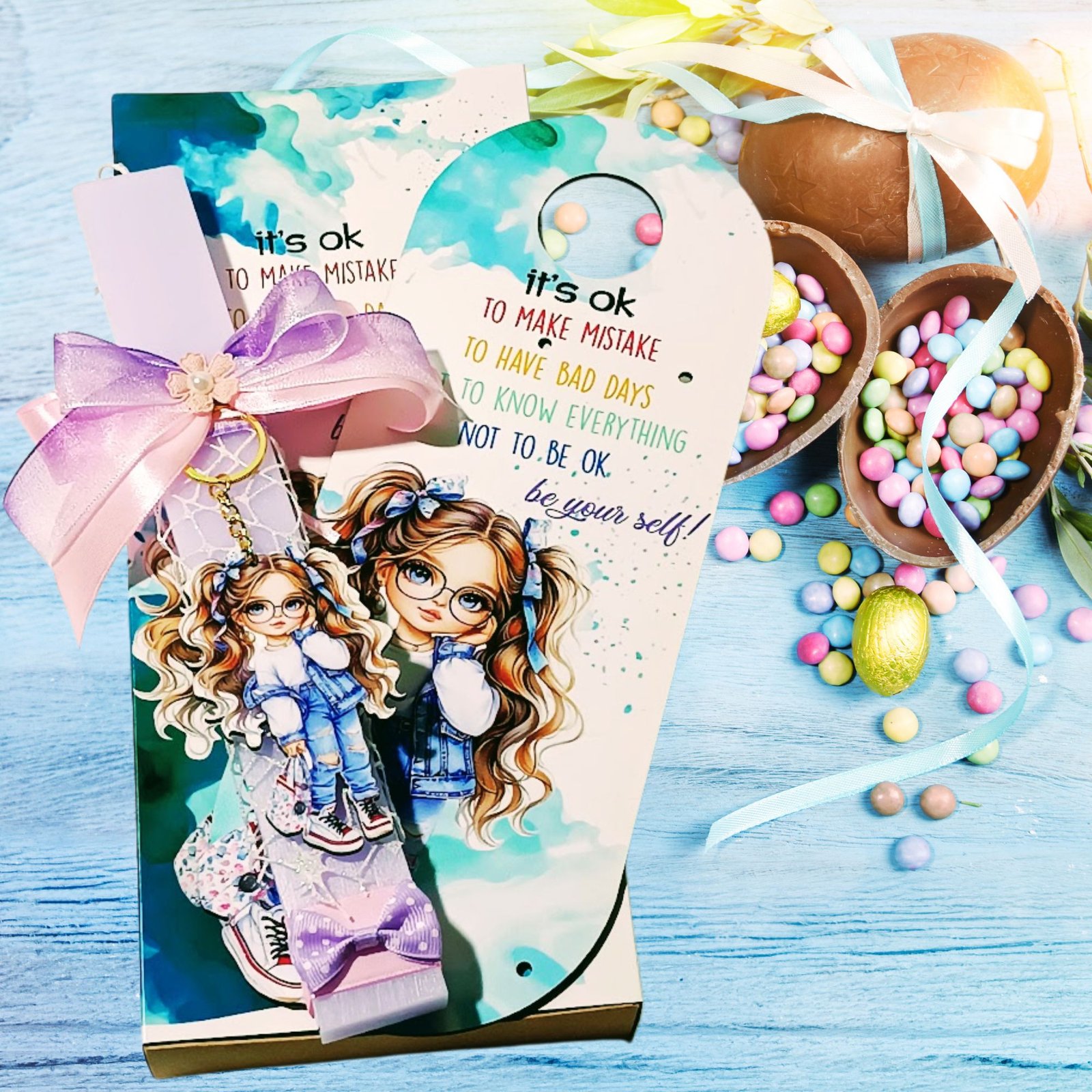 Πασχαλινή λαμπάδα αρωματική με ξύλινο μπρελόκ κορίτσι “be yourself” με ξύλινη πλάτη (door tag) και χάρτινο κουτί!!!