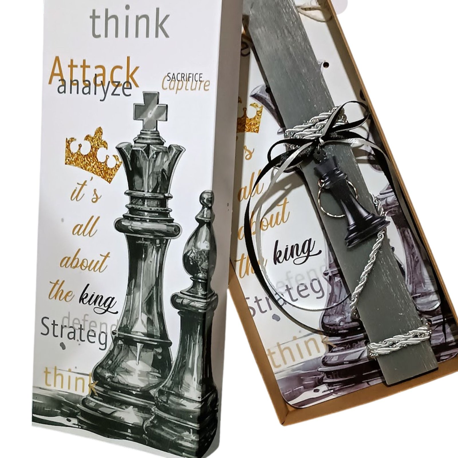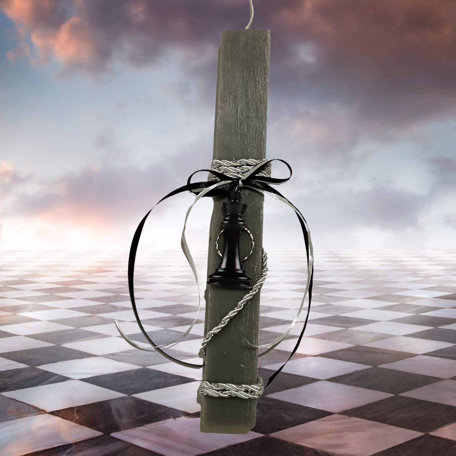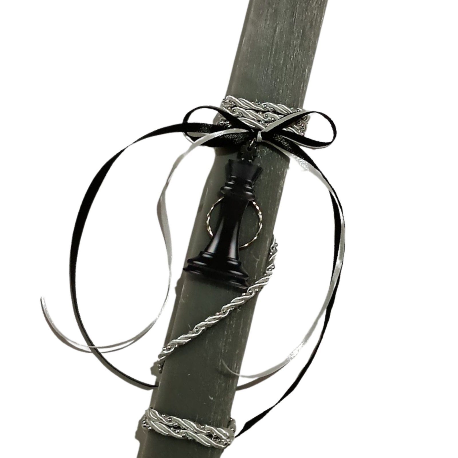 Πασχαλινή λαμπάδα πλακέ αρωματική γκρι με ξύλινο μπρελόκ “Βασιλιάς” σε μαύρο χρώμα, πιόνι από το σκάκι, με ξύλινη πλάτη και χάρτινο κουτί στο ίδιο σχέδιο “it’s all about the King”.