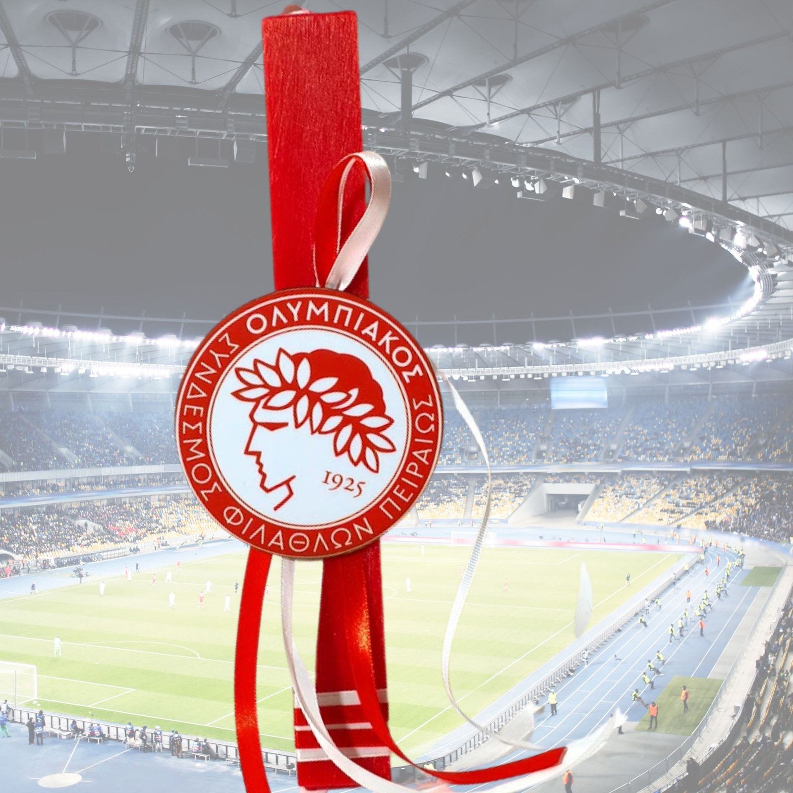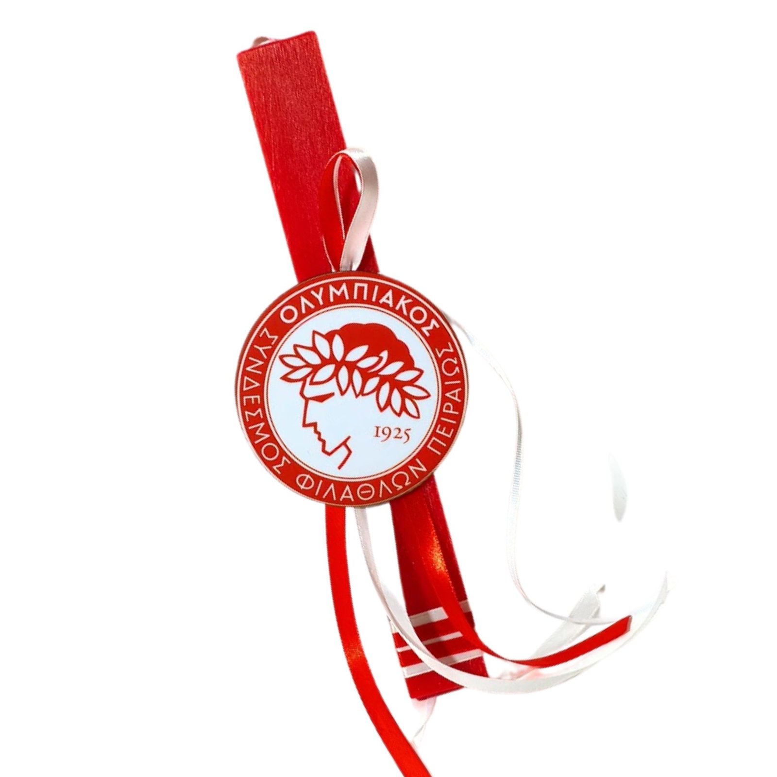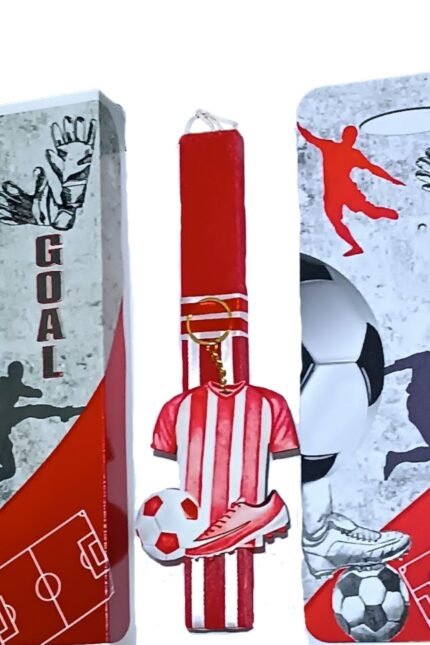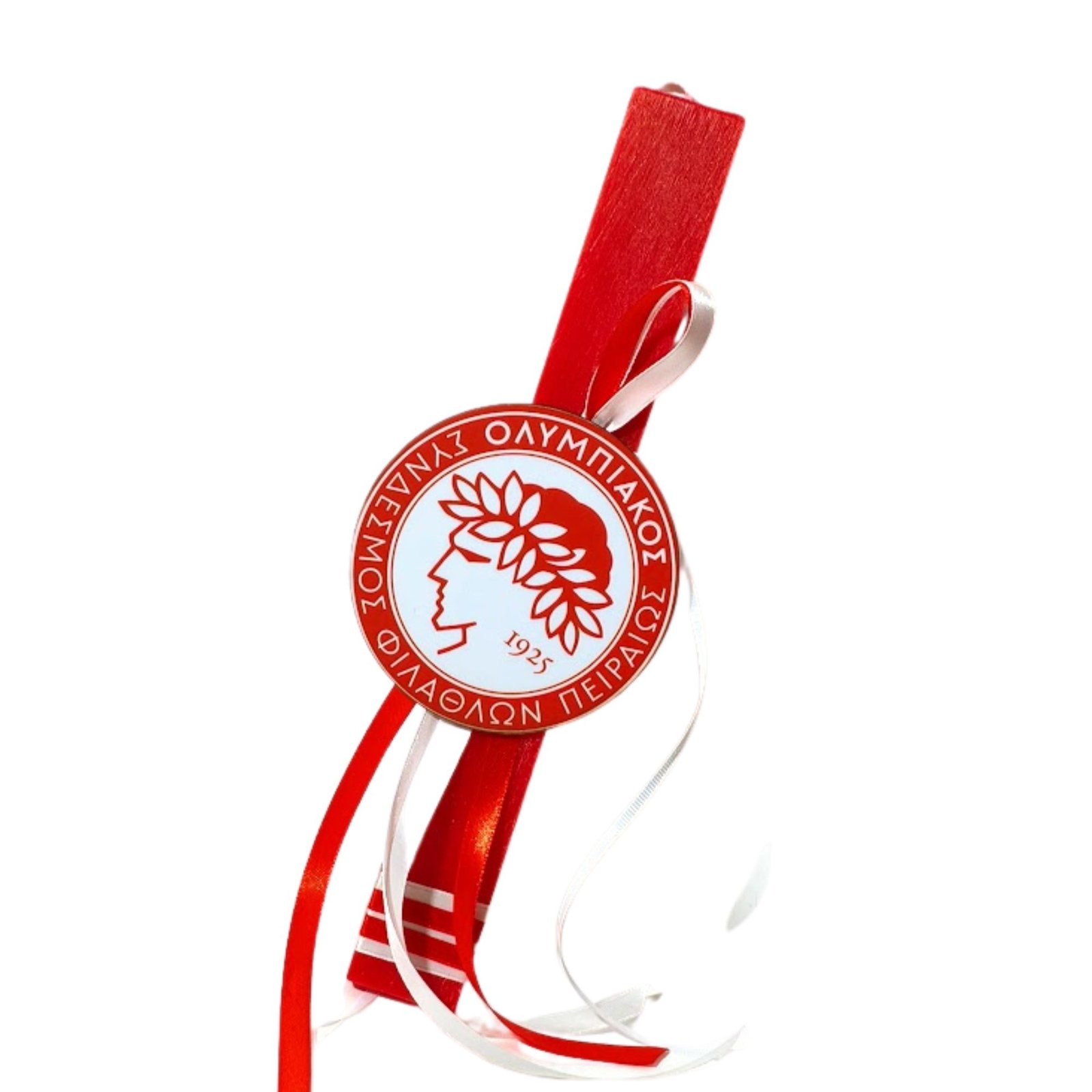 Πασχαλινή λαμπάδα κόκκινη αρωματική πλακέ με το σήμα του Ολυμπιακού, διακοσμημένη διακριτικά με κορδέλες στα χρώματα της αγαπημένης σας ομάδας, τα ερυθρόλευκα!!!