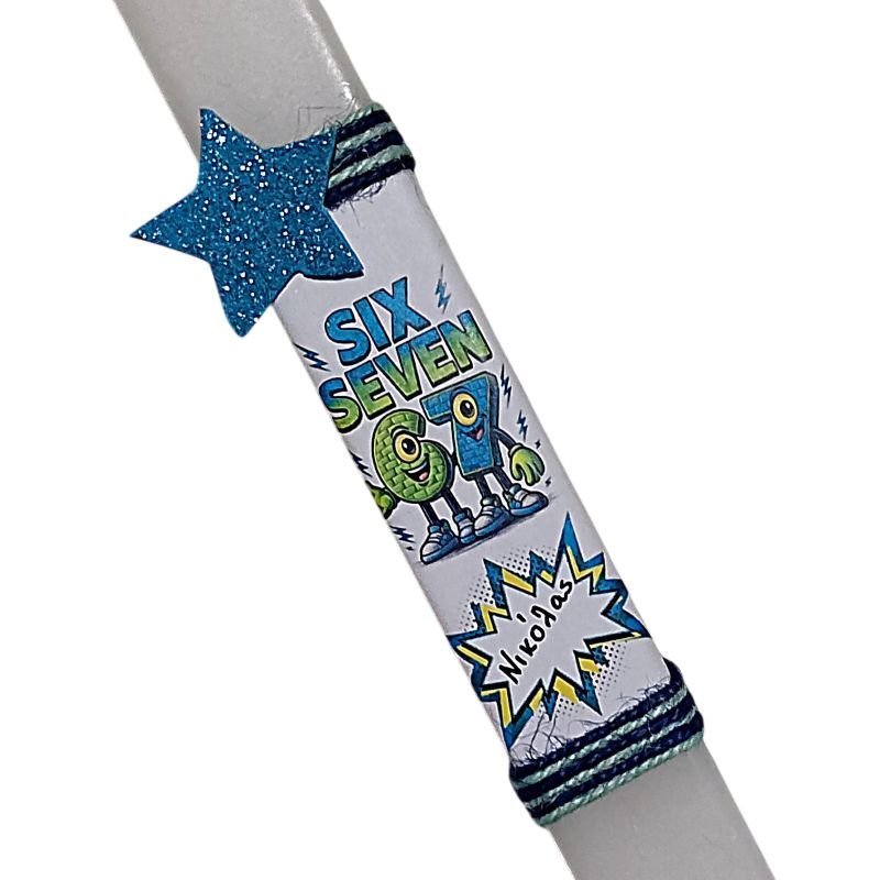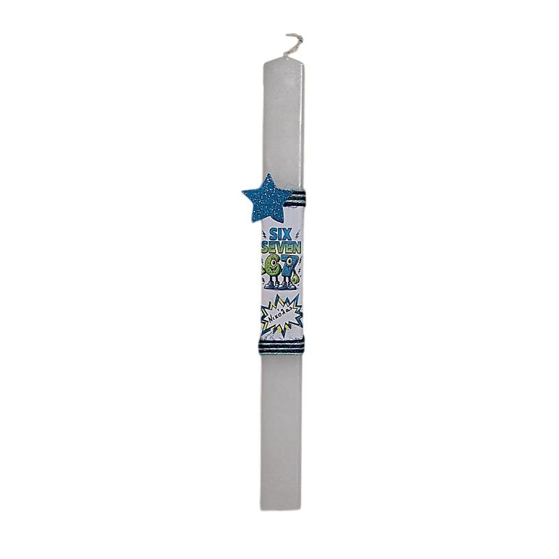 Λαμπάδα πλακέ λευκή ” 67 ” με όνομα ( 30 εκ.) για αγοράκια