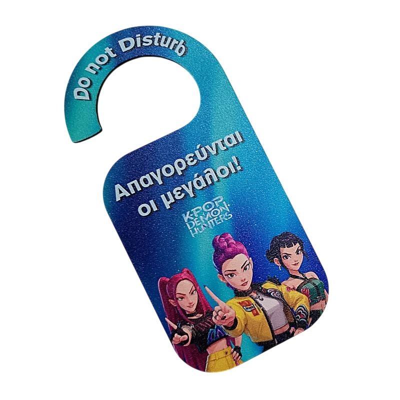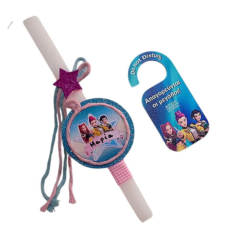 Σετ 2 τεμ. – Λαμπάδα πλακέ λευκή με χειροποίητο κρεμαστό στοιχείο K POP HUNTRIX και το όνομα του παιδιού ( 30 εκ.) και ασορτί ξύλινο HUNGER πόρτας ” Απαγορεύονται οι μεγάλοι ” ( 15 εκ ).