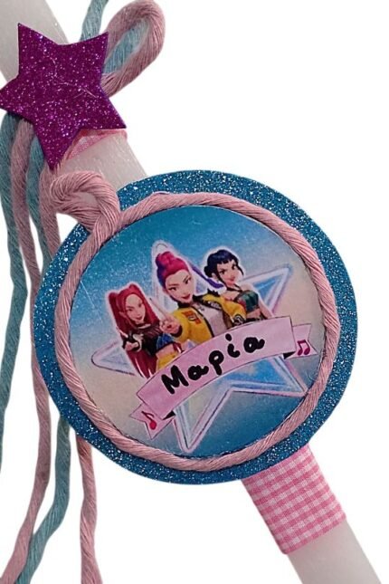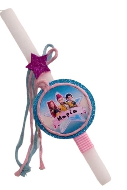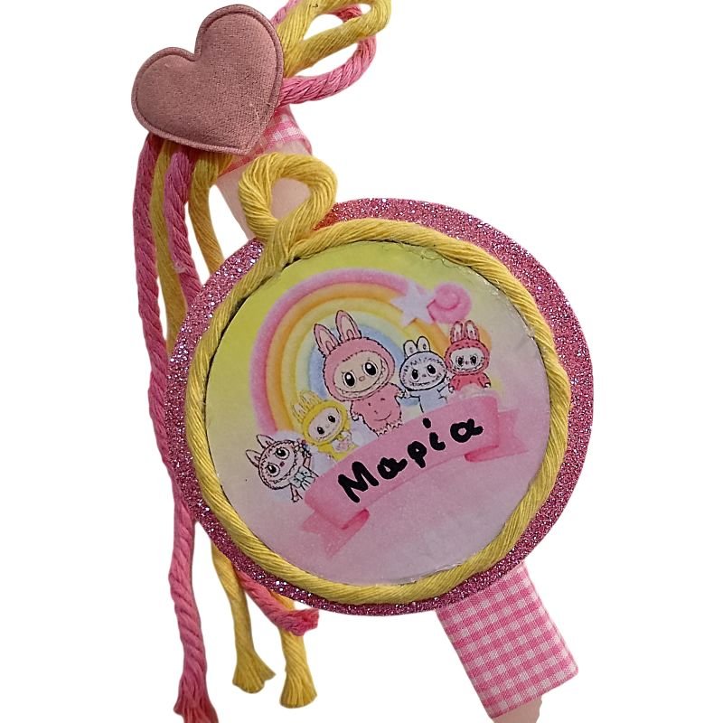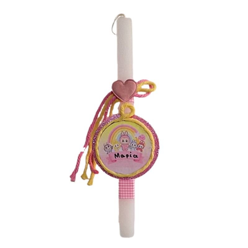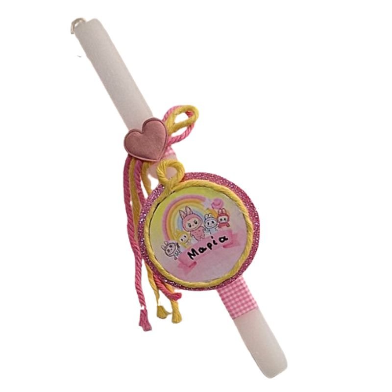 Λαμπάδα πλακέ λευκή με χειροποίητο κρεμαστό στοιχείο LABUBU και το όνομα του παιδιού ( 30 εκ.)