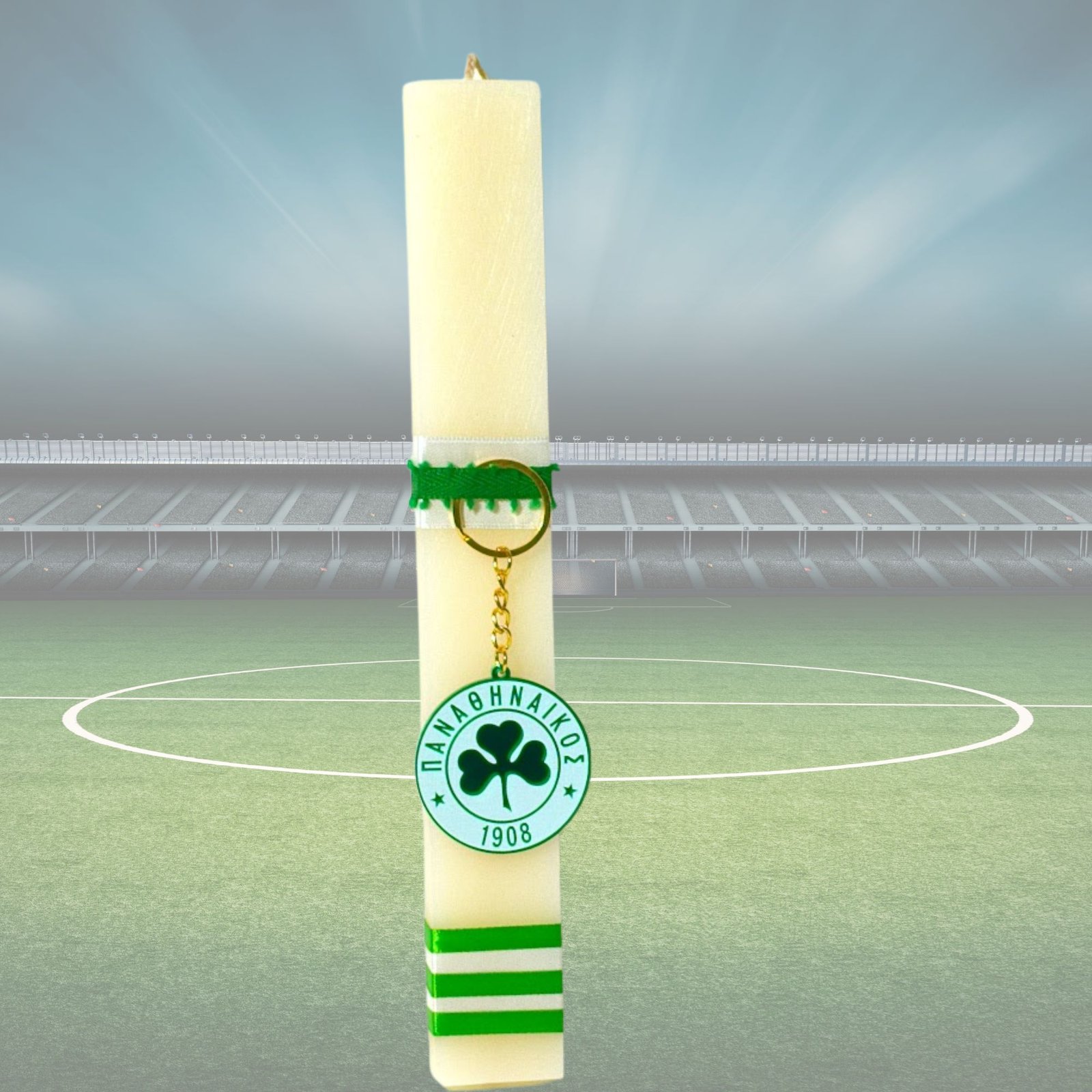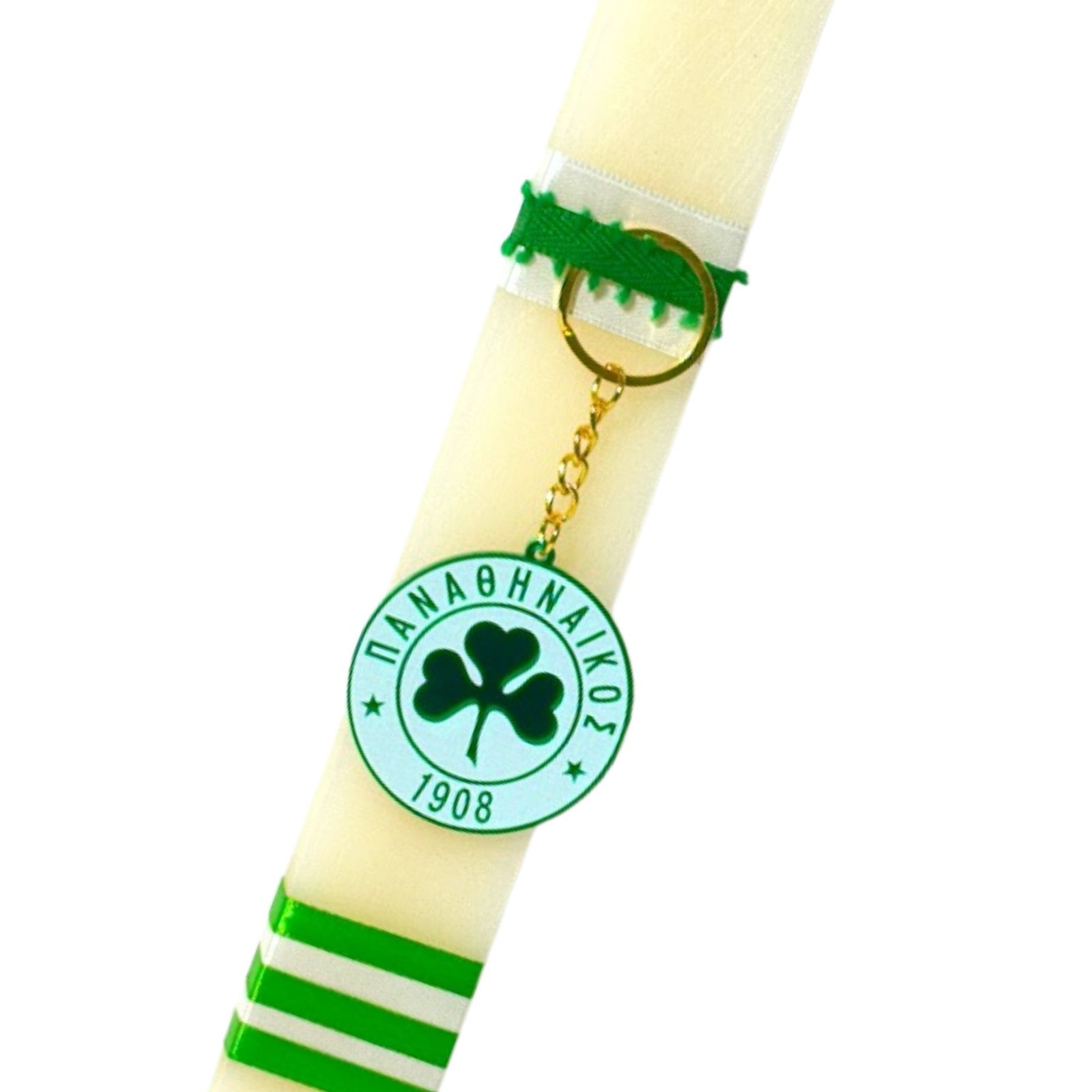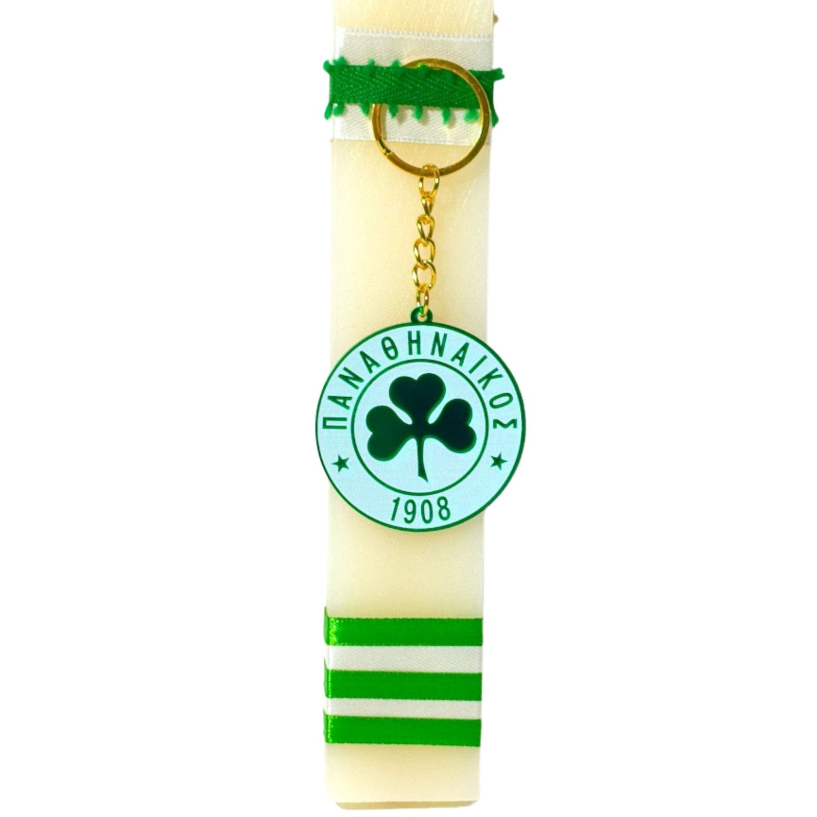 Πασχαλινή λαμπάδα εκρού πλακέ αρωματική με κορδέλες και μπρελόκ πλεξιγκλάς με το σήμα του Παναθηναϊκού, στα χρώματα της αγαπημένης σας ομάδας