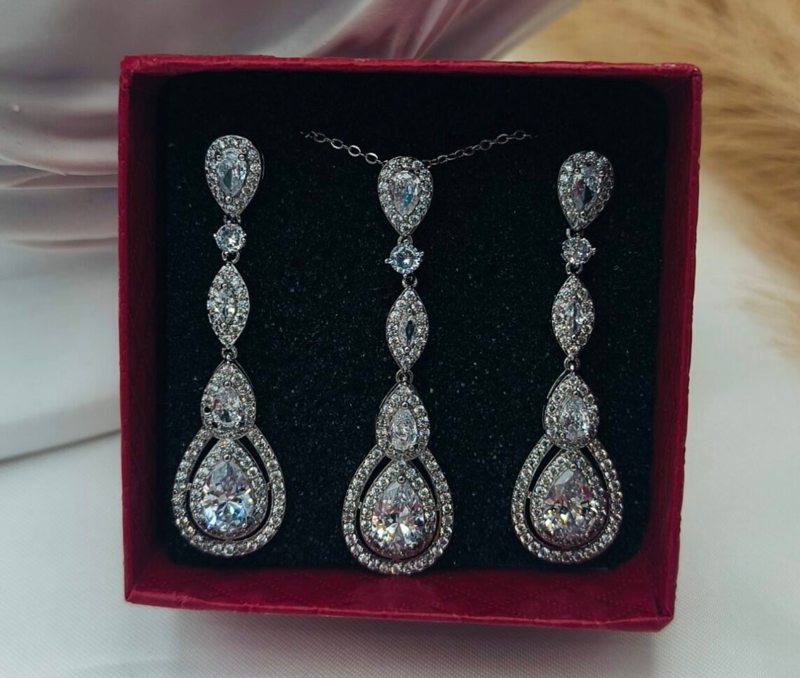 Το σετ περιλαμβάνει κολιέ και σκουλαρίκια διακοσμημένα με υψηλής ποιότητας κρύσταλλα ζιργκόν, που αντανακλούν το φως με κάθε κίνηση, δημιουργώντας μια μαγευτική λάμψη.