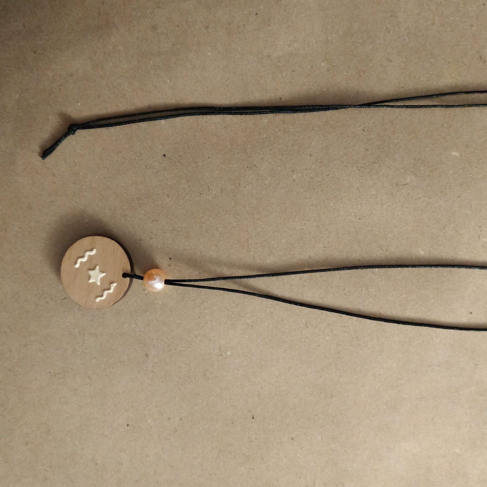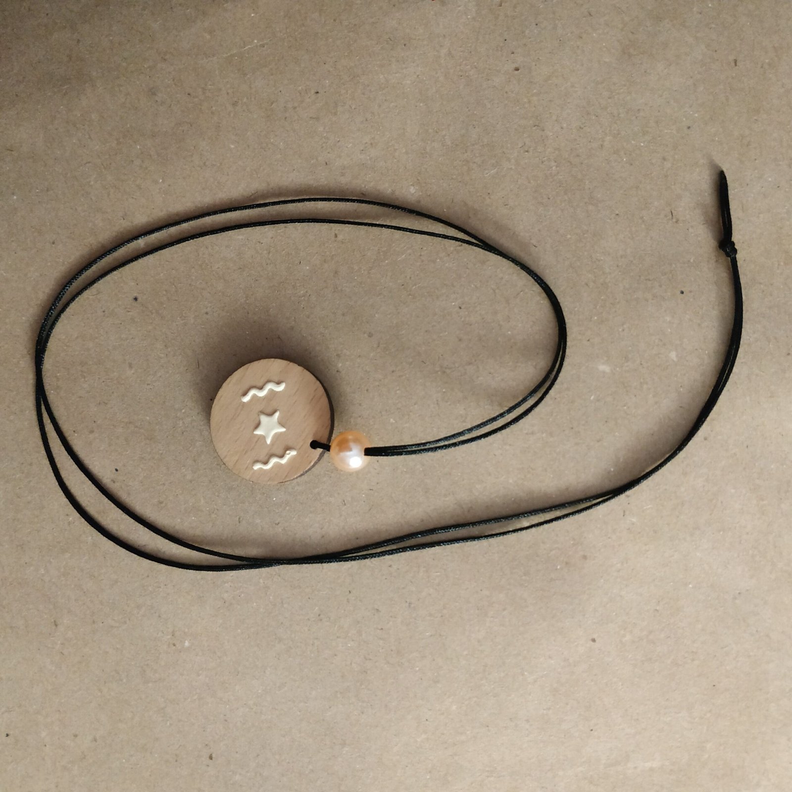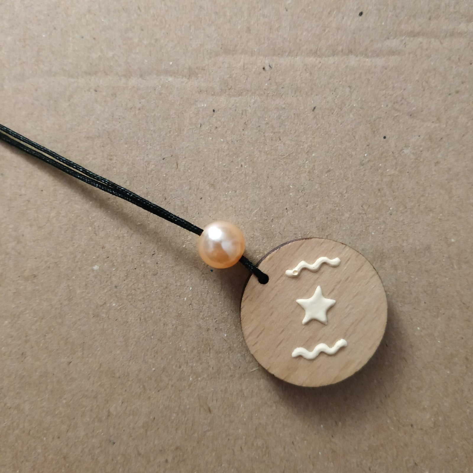 Μακρύ κολιέ μήκους 41εκ. με ξύλο ζωγραφισμένο με χρώματα κιμωλίας, σομόν πέρλα και συνθετικό κορδόνι μαύρου χρώματος. Είναι πάρα πολύ ελαφρύ.