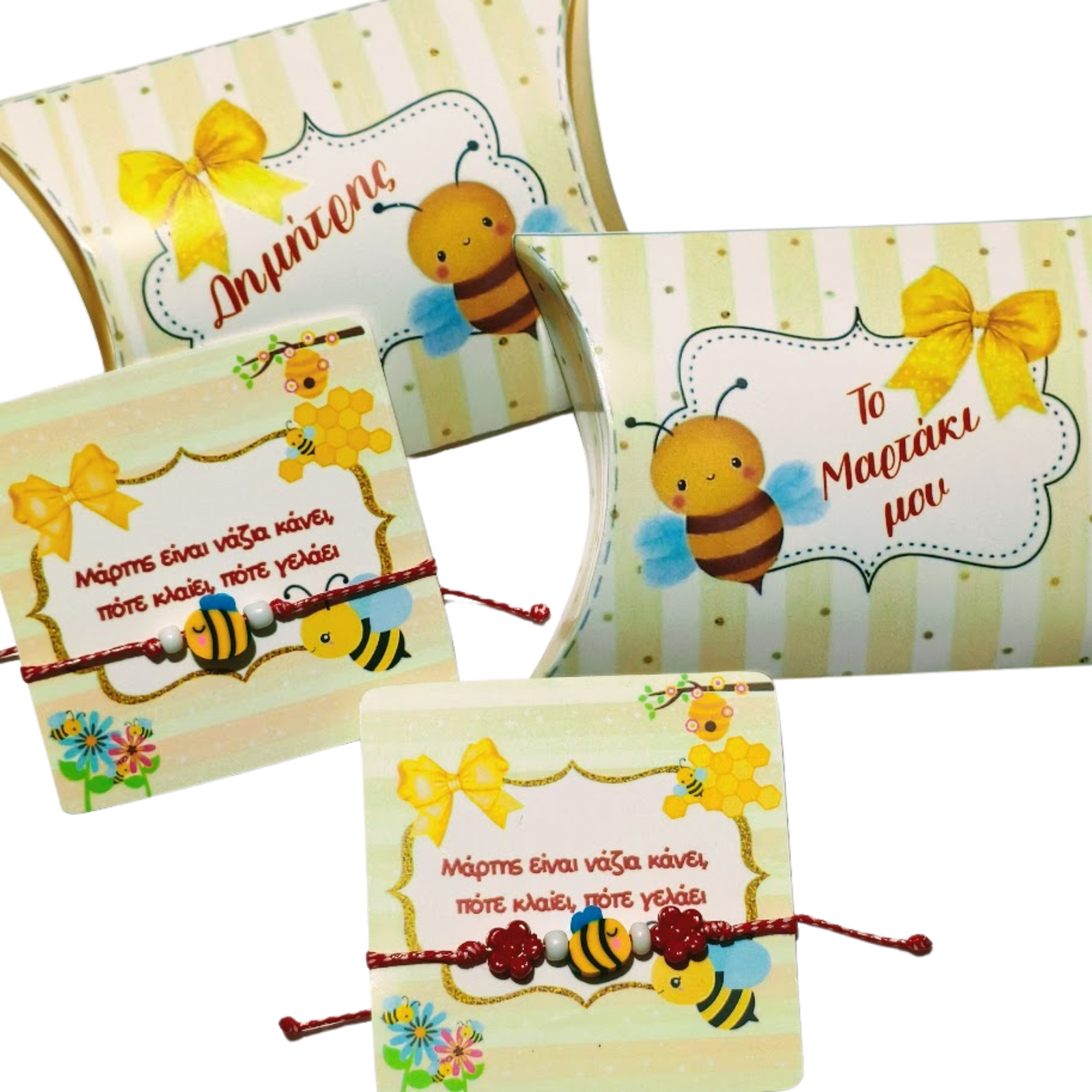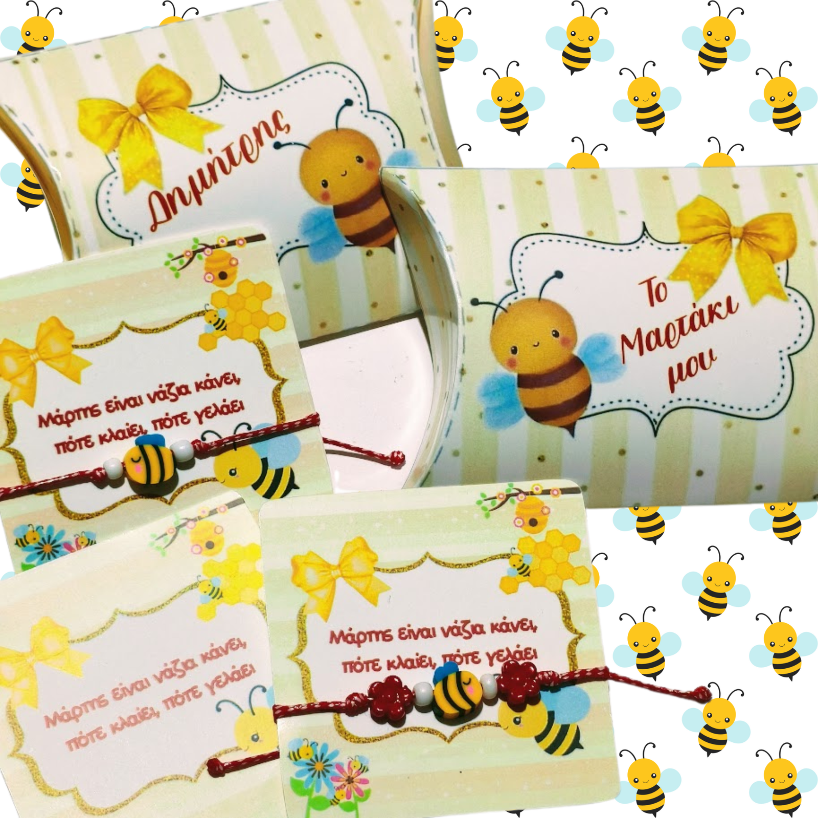 Βραχιόλι “Μάρτης” με μέλισσα από φίμο με καρτελάκι σε κουτάκι με το ίδιο θέμα.
