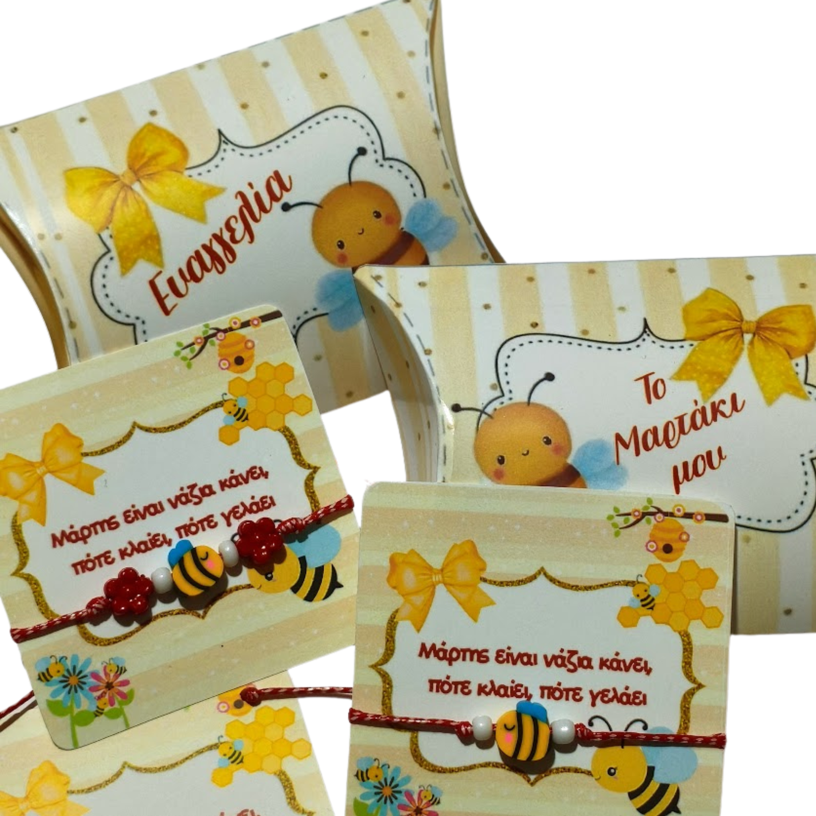 Τα βραχιολάκια έρχονται πάνω σε ανοιξιάτικη κάρτα με παροιμία για τον μήνα Μάρτη και σε κουτάκι με το ίδιο σχέδιο που γράφει “Το Μαρτάκι μου”.