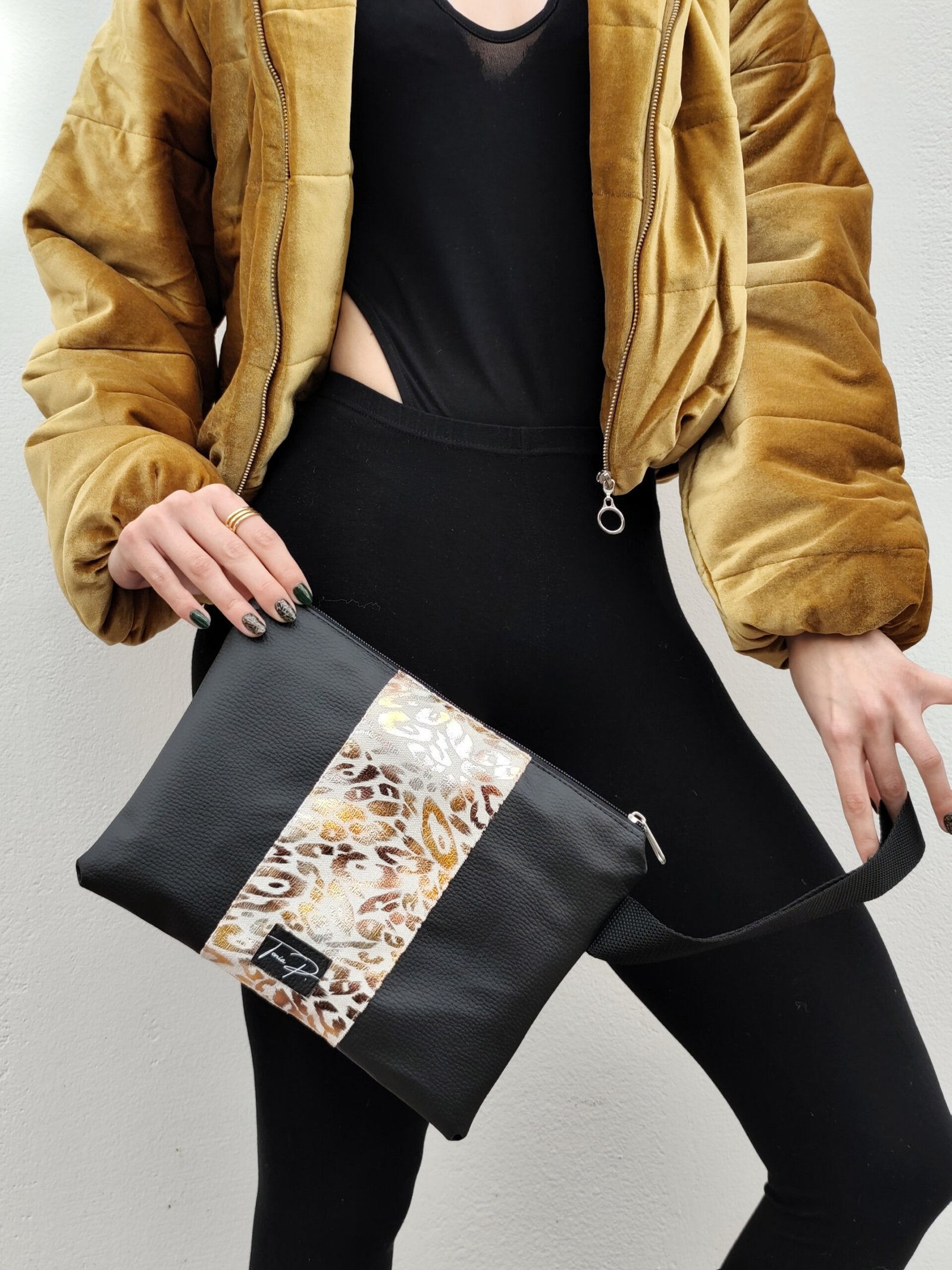 Χειροποίητο νεσεσέρ 25εκ. Από faux δέρμα και ολογραφικό ύφασμα , λεοπάρ. Διαθέτει επένδυση με μαύρη φόδρα & ιμάντα για να φοριέται και στον καρπό.