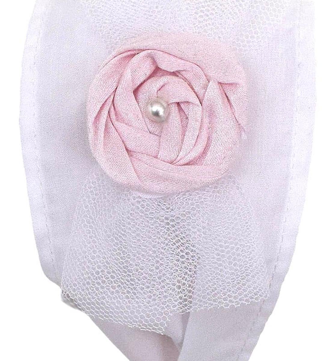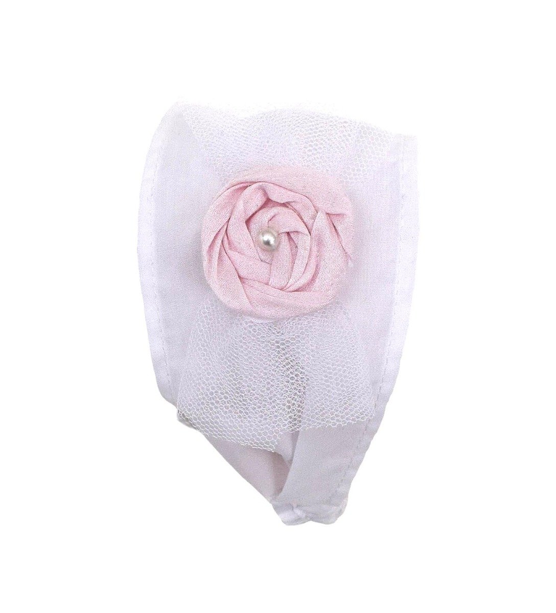 Μπαντάνα βάπτισης από λευκό βαμβακερό ύφασμα με ροζ χειροποίητο λουλούδι και τούλι. Βαπτιστικά ρούχα, ελληνικής ραφής, υψηλής ποιότητας. Παράγονται στον επαγγελματικό μας χώρο κατά παραγγελία στα μέτρα του παιδιού.