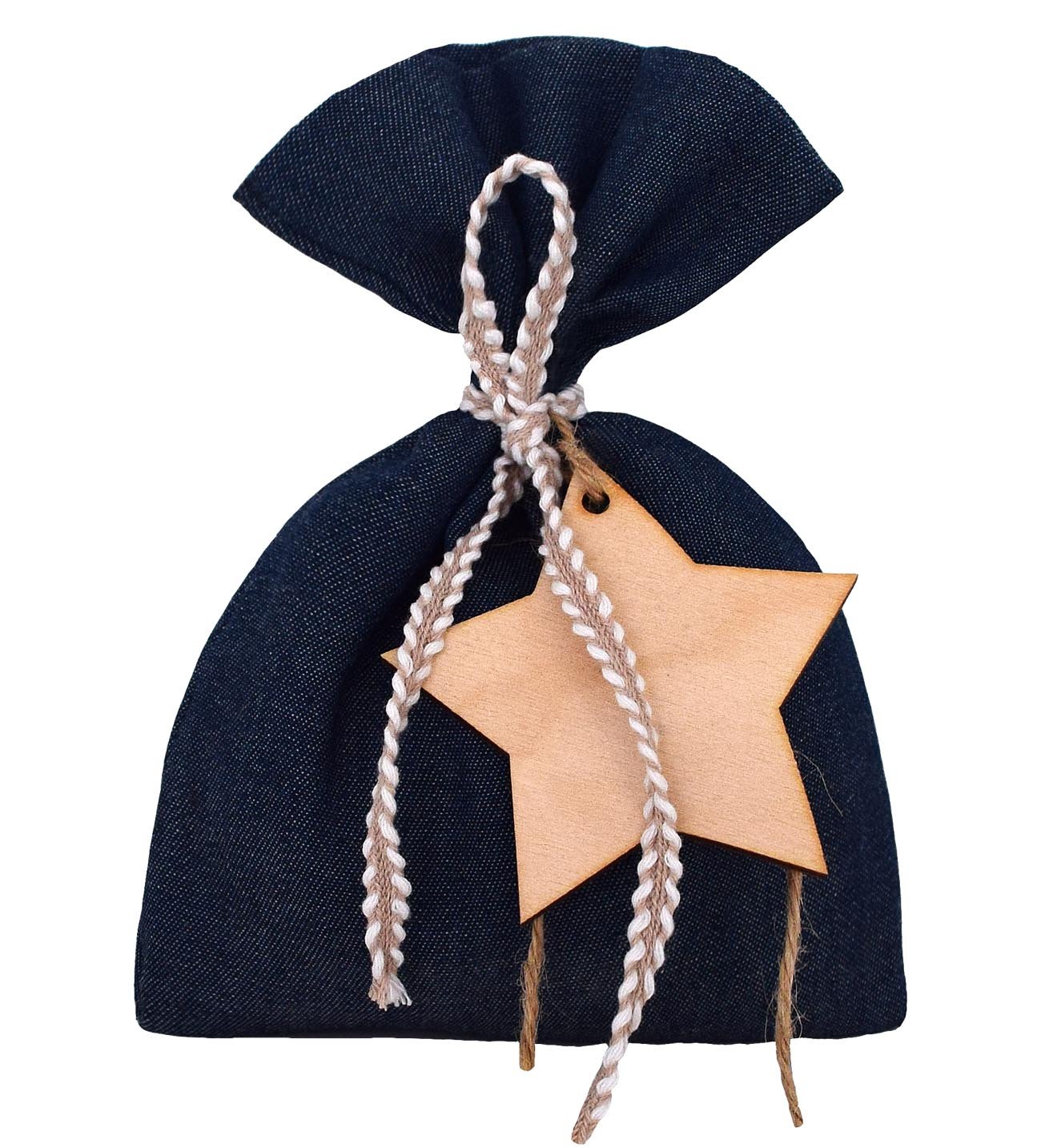 Μπομπονιέρα βάπτισης πουγκί μπλε τζιν, δεμένη με λινάτσα και διακοσμημένη με ξύλινο αστέρι σε φυσικό χρώμα. Στην τιμή περιλαμβάνονται 5 κουφέτα σοκολάτας ή crispies ή κλασικά της εταιρίας Χατζηγιαννάκη. Υπάρχει δυνατότητα τροποποίησης χρωμάτων. Υπάρχει δυνατότητα τα κουφέτα να γίνουν 7 αντί για 5, με επιπλέον επιβάρυνση +0,10€. Χρειαζόμαστε 7-10 εργάσιμες για την παραγωγή τους. Παρακαλούμε αν επιθυμείτε αλλαγές μπορείτε να τις σημειώσετε στα σχόλια. B2015