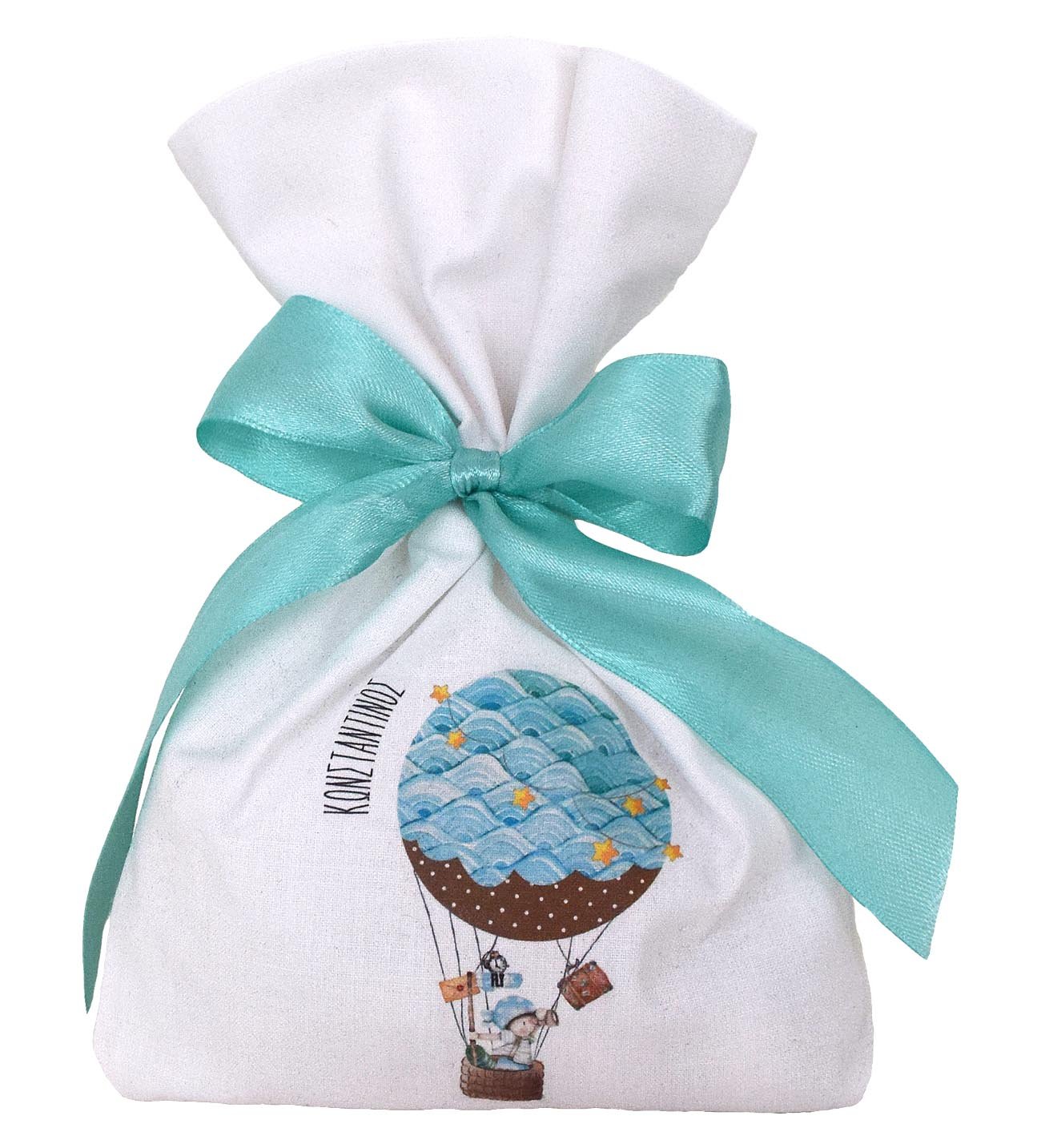 Μπομπονιέρα βάπτισης λευκό πουγκί με τυπωμένο αερόστατο και το όνομα “Κωνσταντίνος”, δεμένη με βεραμάν σατέν κορδέλα. Στην τιμή περιλαμβάνονται 5 κουφέτα σοκολάτας ή crispies ή κλασικά της εταιρίας Χατζηγιαννάκη. Υπάρχει δυνατότητα τροποποίησης χρωμάτων. Υπάρχει δυνατότητα τα κουφέτα να γίνουν 7 αντί για 5, με επιπλέον επιβάρυνση +0,10€. Χρειαζόμαστε 7-10 εργάσιμες για την παραγωγή τους. Παρακαλούμε σημειώσετε στα σχόλια το όνομα που επιθυμείτε να τυπωθεί. B2009