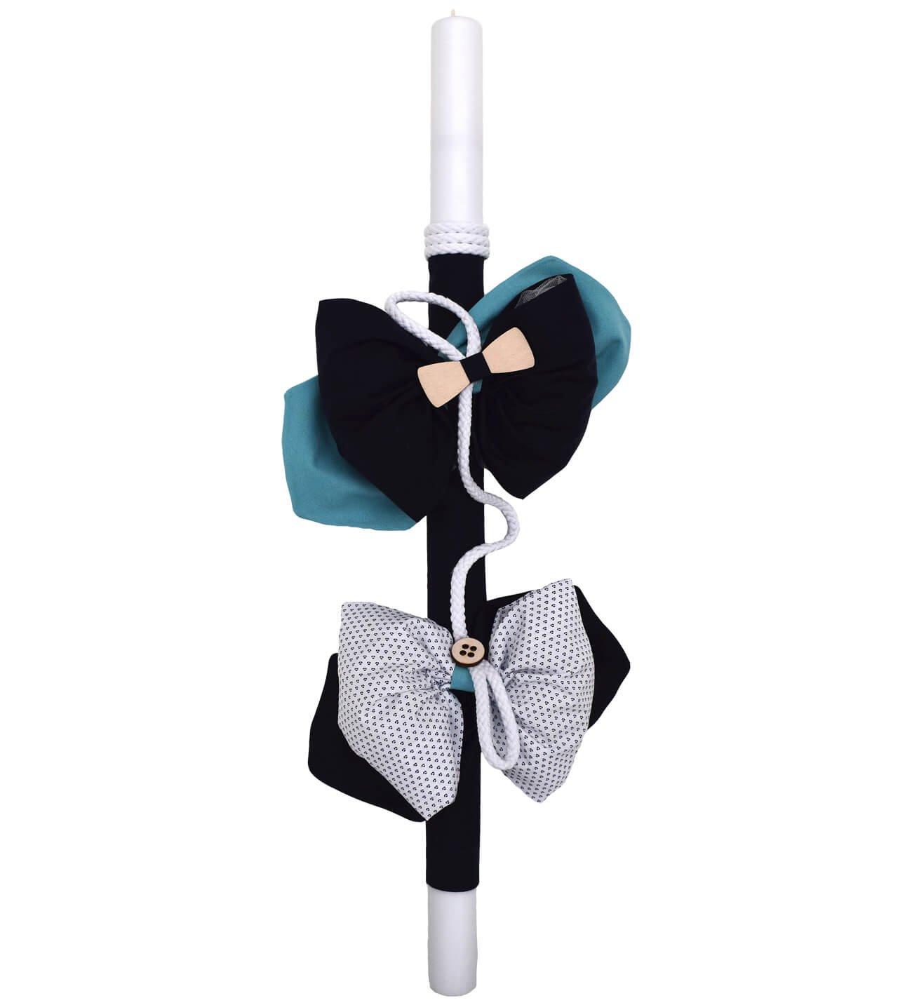 Λαμπάδα βάπτισης από μπλε, τιρκουάζ και εμπρομέ υφασμάτινους φιόγκους, σχοινιά, ξύλινο παπιόν και κουμπί. Ελληνικής κατασκευής. Ύψος λαμπάδας 0,80 μέτρα. Χρόνος καύσης κεριού 3 ώρες. Σχεδιασμένη ώστε να αντέχει στις υψηλές θερμοκρασίες κατά την αποστολή παραγγελίας. Συσκευάζεται έτσι ώστε να μην υπάρχει καμία φθορά στην μεταφορά της. Σε περίπτωση φθοράς κεριού κατά την μεταφορά, μας την επιστρέφετε και σας στέλνουμε καινούρια με δικά μας έξοδα μεταφοράς.