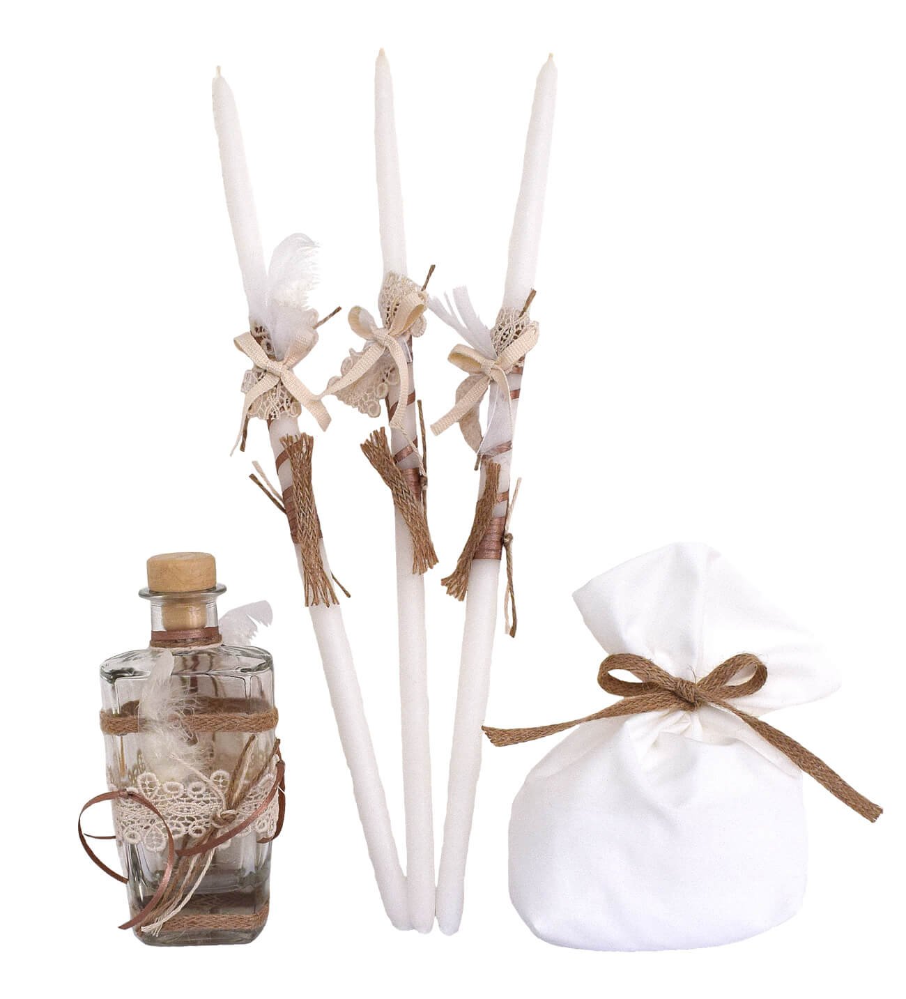 Σετ λαδιού βάπτισης Σετ λαδιού βάπτισης διακοσμημένο από σχοίνινη κορδέλα, πλεκτή δαντελα και φτερά. Ελληνικής παραγωγής.