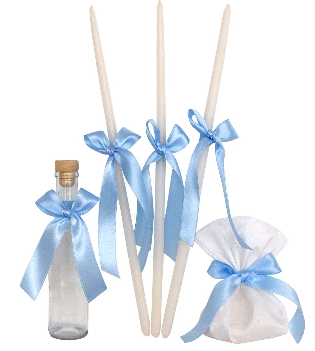 Σετ λαδιού βάπτισης διακοσμημένο από σιέλ σατέν κορδέλες. Ελληνικής παραγωγής.