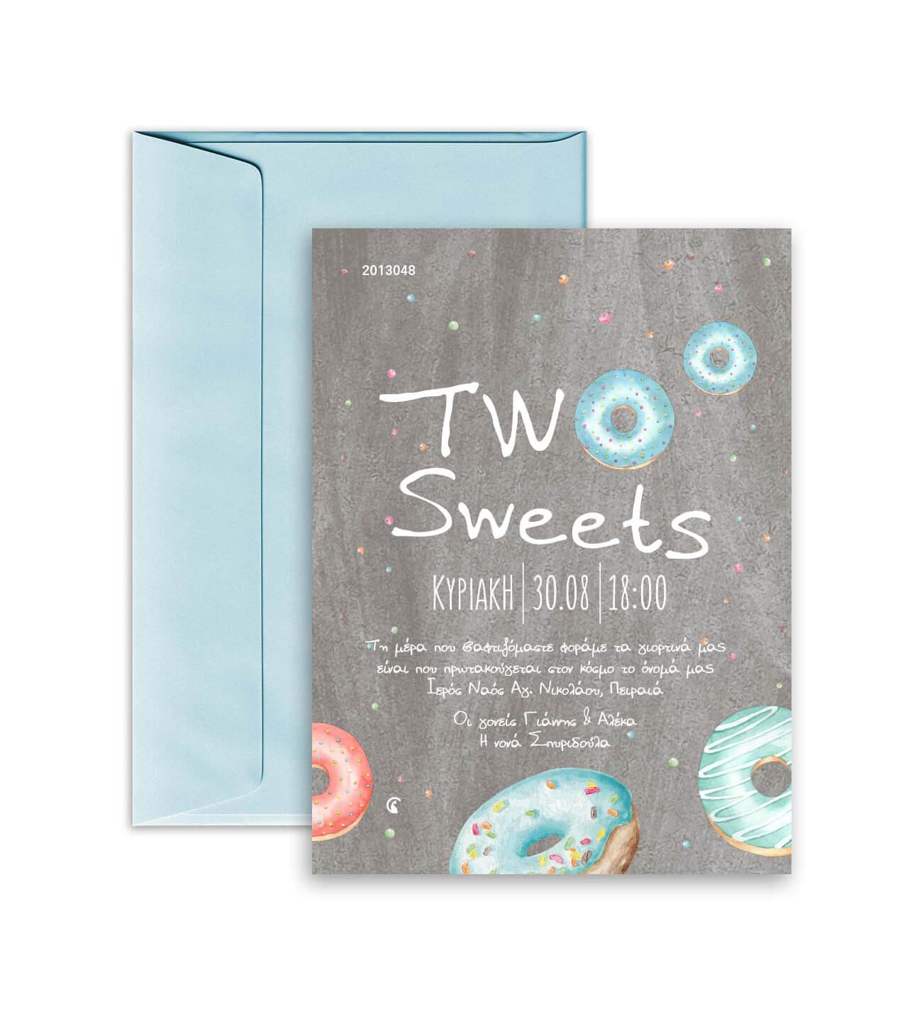 Προσκλητήριο βάπτισης, με θέμα ντόνατ. ΜΕ ΦΑΚΕΛΟ. Διαστάσεις: 14εκ. x 19εκ. (Υπάρχει περίπτωση το τελικό να αποκλείνει 5% από τις παραπάνω διαστάσεις) Υλικό χαρτιού: Οπαλίνα 300 γραμμαρίων Προσοχή: Για να ισχύει η αγορά του προϊόντος πρέπει να αγοράσετε και την ΜΑΚΕΤΑ. Χρειαζόμαστε 7-10 εργάσιμες για την παραγωγή τους, από τη δική σας έγκριση, μετά την παραλαβή της μακέτας. Παρακαλούμε στα σχόλια γράψτε μας τις πληροφορίες για το προσκλητήριο, για γρηγορότερη παραγωγή μακέτας. 2013048