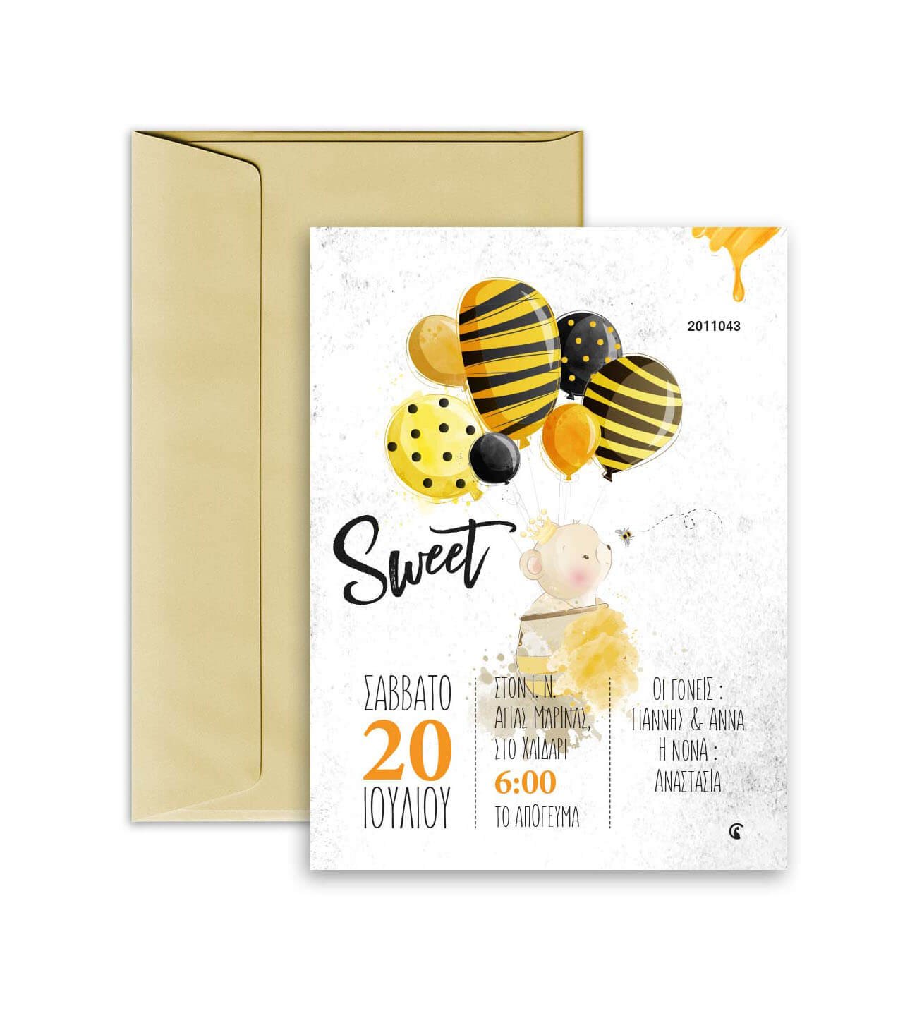 Προσκλητήριο βάπτισης, με θέμα το μέλι. ΜΕ ΦΑΚΕΛΟ. Διαστάσεις: 14εκ. x 19εκ. (Υπάρχει περίπτωση το τελικό να αποκλείνει 5% από τις παραπάνω διαστάσεις) Υλικό χαρτιού: Οπαλίνα 300 γραμμαρίων Προσοχή: Για να ισχύει η αγορά του προϊόντος πρέπει να αγοράσετε και την ΜΑΚΕΤΑ. Χρειαζόμαστε 7-10 εργάσιμες για την παραγωγή τους, από τη δική σας έγκριση, μετά την παραλαβή της μακέτας. Παρακαλούμε στα σχόλια γράψτε μας τις πληροφορίες για το προσκλητήριο, για γρηγορότερη παραγωγή μακέτας. 2011043