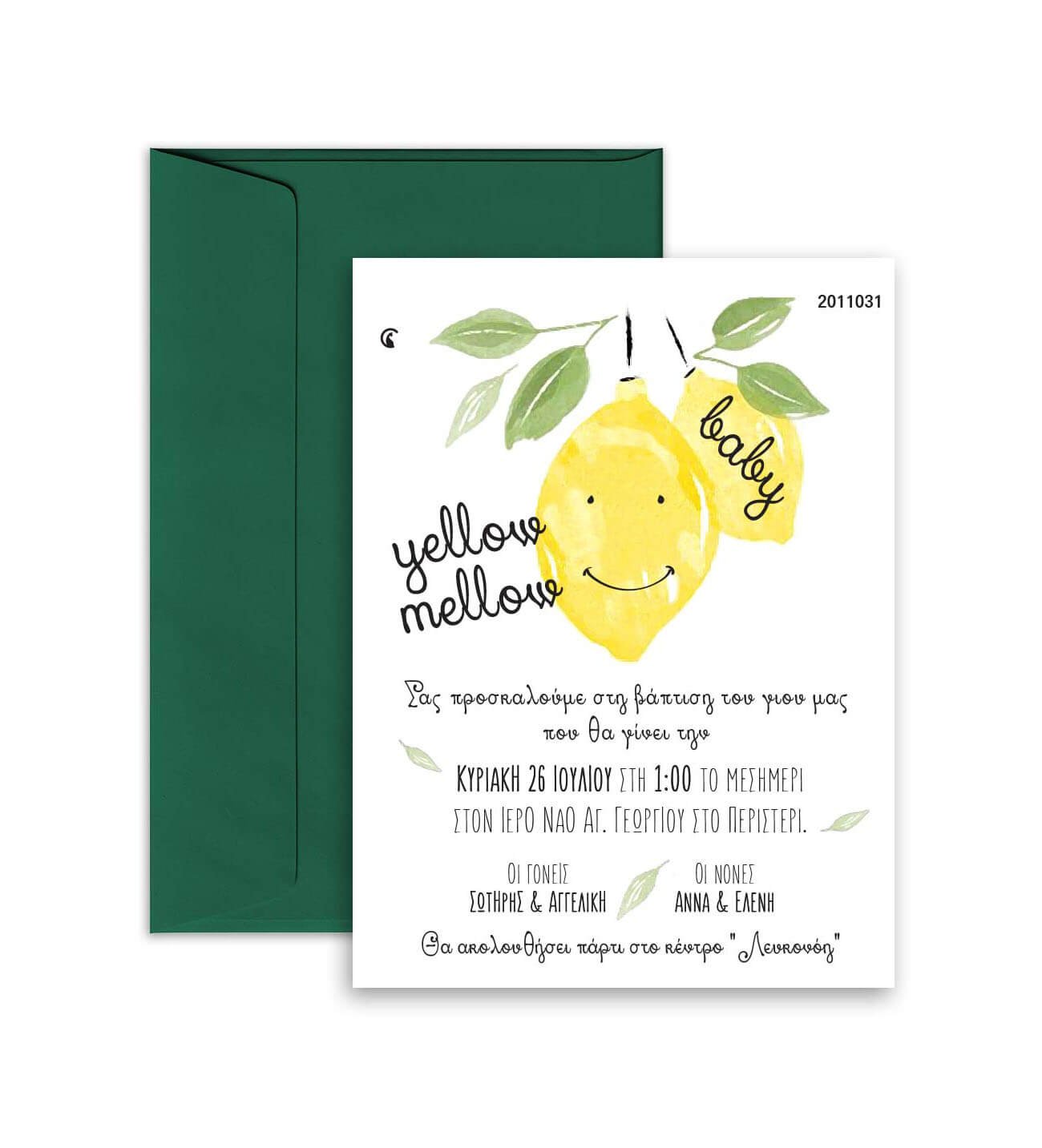 Προσκλητήριο βάπτισης, με θέμα λεμόνι. ΜΕ ΦΑΚΕΛΟ. Διαστάσεις: 14εκ. x 19εκ. (Υπάρχει περίπτωση το τελικό να αποκλείνει 5% από τις παραπάνω διαστάσεις) Υλικό χαρτιού: Οπαλίνα 300 γραμμαρίων Προσοχή: Για να ισχύει η αγορά του προϊόντος πρέπει να αγοράσετε και την ΜΑΚΕΤΑ. Χρειαζόμαστε 7-10 εργάσιμες για την παραγωγή τους, από τη δική σας έγκριση, μετά την παραλαβή της μακέτας. Παρακαλούμε στα σχόλια γράψτε μας τις πληροφορίες για το προσκλητήριο, για γρηγορότερη παραγωγή μακέτας. 2011031