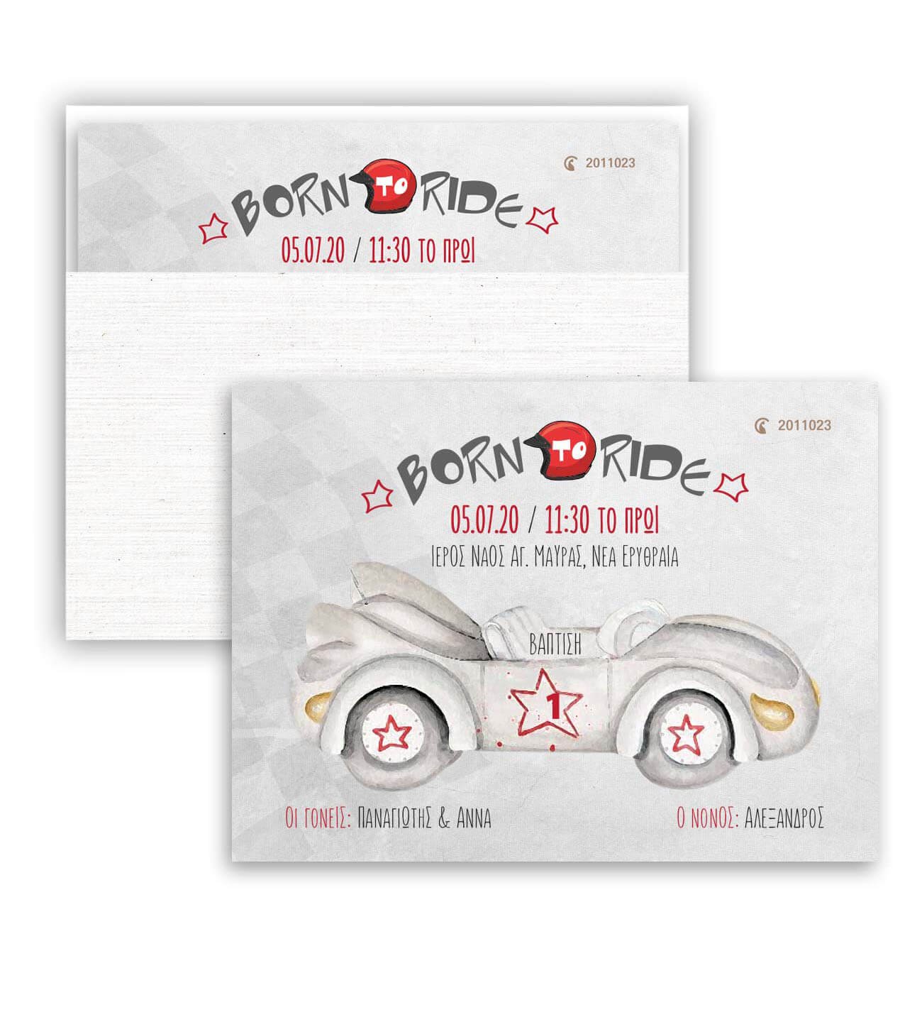 Προσκλητήριο βάπτισης, με θέμα αγωνιστικό αυτοκίνητο. ΜΕ ΦΑΚΕΛΟ. Διαστάσεις: 19εκ. x 14εκ. (Υπάρχει περίπτωση το τελικό να αποκλείνει 5% από τις παραπάνω διαστάσεις) Υλικό χαρτιού: Οπαλίνα 300 γραμμαρίων Προσοχή: Για να ισχύει η αγορά του προϊόντος πρέπει να αγοράσετε και την ΜΑΚΕΤΑ. Χρειαζόμαστε 7-10 εργάσιμες για την παραγωγή τους, από τη δική σας έγκριση, μετά την παραλαβή της μακέτας. Παρακαλούμε στα σχόλια γράψτε μας τις πληροφορίες για το προσκλητήριο, για γρηγορότερη παραγωγή μακέτας. 2011023