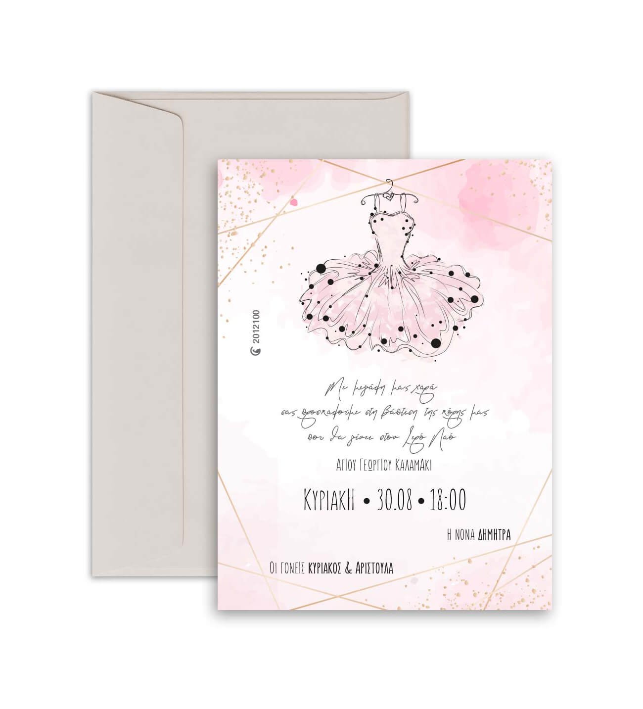 Προσκλητήριο βάπτισης, με θέμα μπαλαρίνα. ΜΕ ΦΑΚΕΛΟ. Διαστάσεις: 14εκ. x 19εκ. (Υπάρχει περίπτωση το τελικό να αποκλείνει 5% από τις παραπάνω διαστάσεις) Υλικό χαρτιού: Οπαλίνα 300 γραμμαρίων Προσοχή: Για να ισχύει η αγορά του προϊόντος πρέπει να αγοράσετε και την ΜΑΚΕΤΑ. Χρειαζόμαστε 7-10 εργάσιμες για την παραγωγή τους, από τη δική σας έγκριση, μετά την παραλαβή της μακέτας. Παρακαλούμε στα σχόλια γράψτε μας τις πληροφορίες για το προσκλητήριο, για γρηγορότερη παραγωγή μακέτας. 2012100