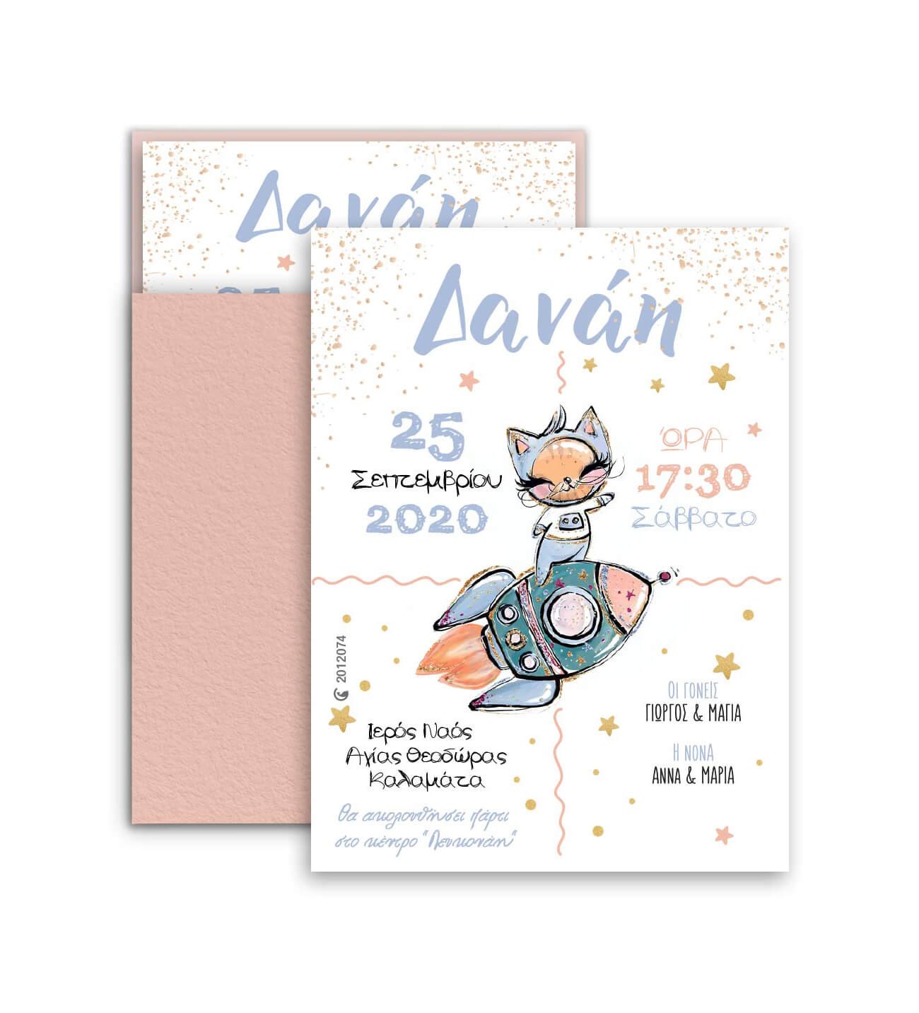 Προσκλητήριο βάπτισης, με θέμα γατάκι αστροναύτης. ΜΕ ΦΑΚΕΛΟ. Διαστάσεις: 14εκ. x 19εκ. (Υπάρχει περίπτωση το τελικό να αποκλείνει 5% από τις παραπάνω διαστάσεις) Υλικό χαρτιού: Οπαλίνα 300 γραμμαρίων Προσοχή: Για να ισχύει η αγορά του προϊόντος πρέπει να αγοράσετε και την ΜΑΚΕΤΑ. Χρειαζόμαστε 7-10 εργάσιμες για την παραγωγή τους, από τη δική σας έγκριση, μετά την παραλαβή της μακέτας. Παρακαλούμε στα σχόλια γράψτε μας τις πληροφορίες για το προσκλητήριο, για γρηγορότερη παραγωγή μακέτας. 2012074