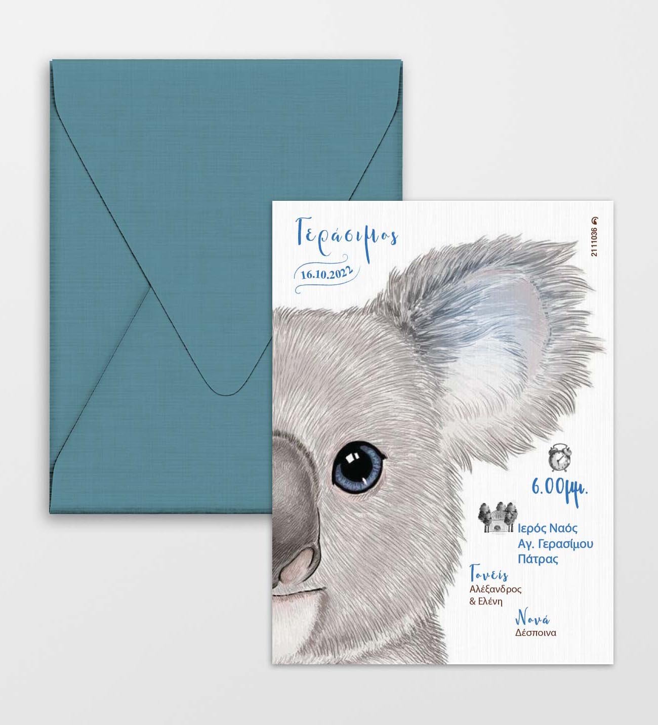Προσκλητήριο βάπτισης, με θέμα κοάλα. ΜΕ ΦΑΚΕΛΟ. Διαστάσεις: 14εκ. x 19εκ. (Υπάρχει περίπτωση το τελικό να αποκλείνει 5% από τις παραπάνω διαστάσεις) Υλικό χαρτιού: Οπαλίνα 300 γραμμαρίων Προσοχή: Για να ισχύει η αγορά του προϊόντος πρέπει να αγοράσετε και την ΜΑΚΕΤΑ. Χρειαζόμαστε 7-10 εργάσιμες για την παραγωγή τους, από τη δική σας έγκριση, μετά την παραλαβή της μακέτας. Παρακαλούμε στα σχόλια γράψτε μας τις πληροφορίες για το προσκλητήριο, για γρηγορότερη παραγωγή μακέτας. 2111036
