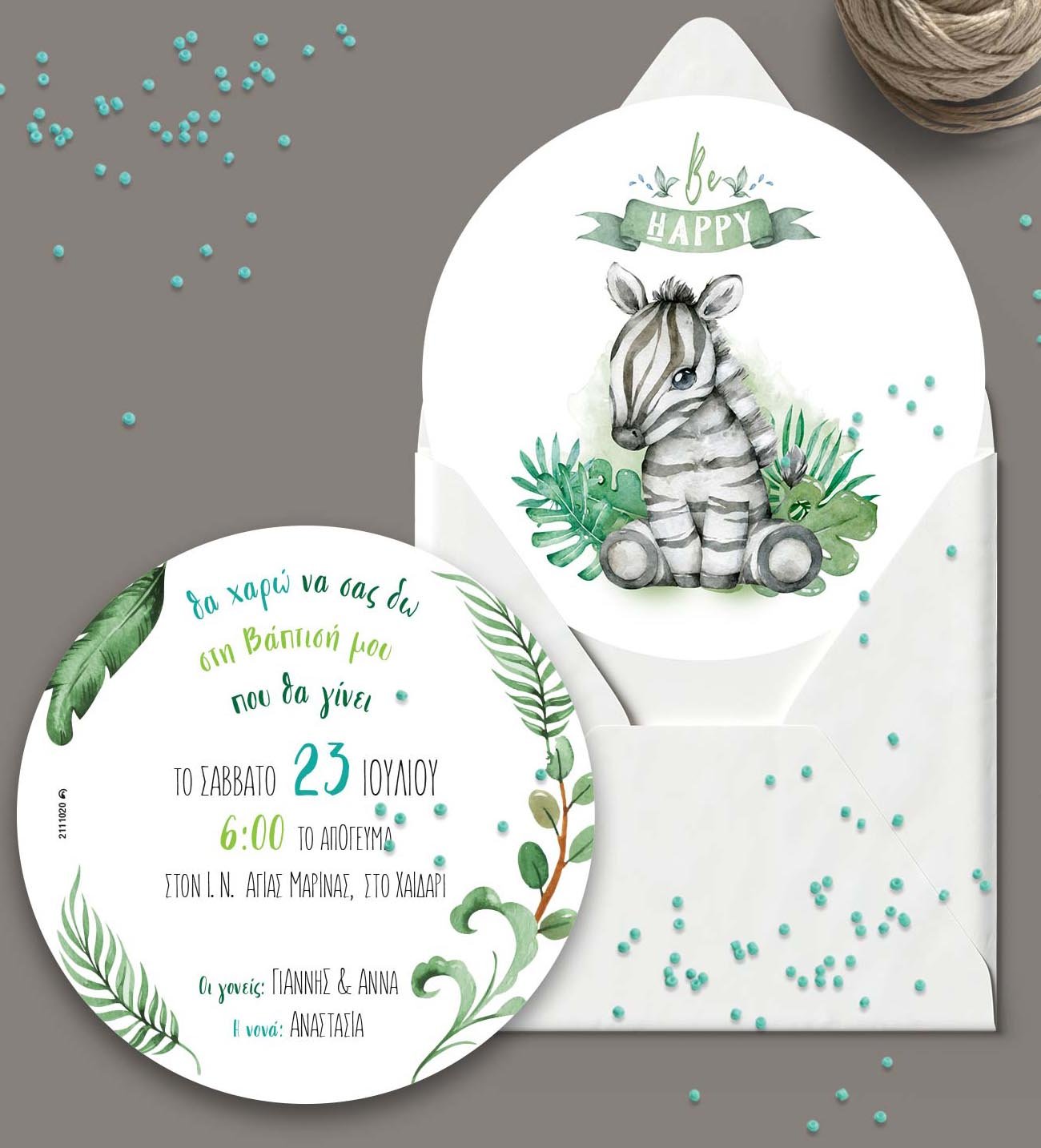Προσκλητήριο βάπτισης, με θέμα ζέβρα. ΜΕ ΦΑΚΕΛΟ. Διαστάσεις: 19εκ. διάμετρο (Υπάρχει περίπτωση το τελικό να αποκλείνει 5% από τις παραπάνω διαστάσεις) Υλικό χαρτιού: Οπαλίνα 300 γραμμαρίων Προσοχή: Για να ισχύει η αγορά του προϊόντος πρέπει να αγοράσετε και την ΜΑΚΕΤΑ. Χρειαζόμαστε 7-10 εργάσιμες για την παραγωγή τους, από τη δική σας έγκριση, μετά την παραλαβή της μακέτας. Παρακαλούμε στα σχόλια γράψτε μας τις πληροφορίες για το προσκλητήριο, για γρηγορότερη παραγωγή μακέτας. 2111020