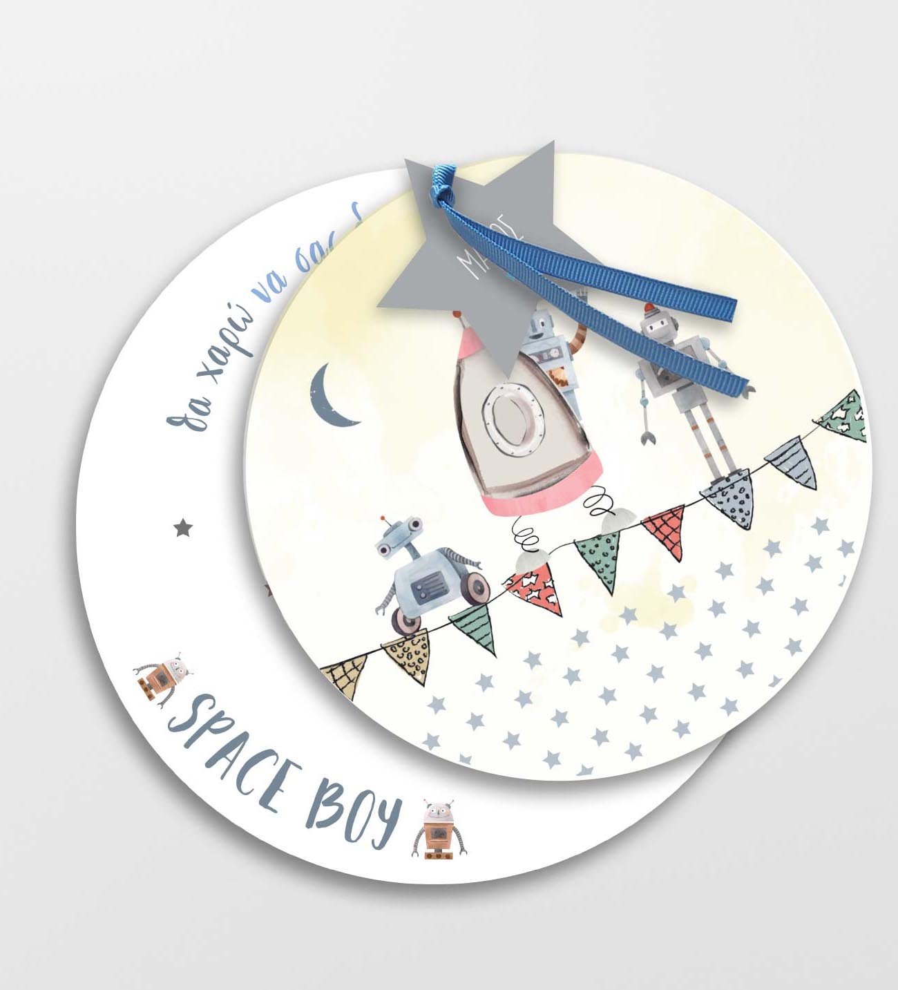 Προσκλητήριο βάπτισης, με θέμα ρομότ. Διαστάσεις: 19εκ. διάμετορς (Υπάρχει περίπτωση το τελικό να αποκλείνει 5% από τις παραπάνω διαστάσεις) Υλικό χαρτιού: Οπαλίνα 300 γραμμαρίων Προσοχή: Για να ισχύει η αγορά του προϊόντος πρέπει να αγοράσετε και την ΜΑΚΕΤΑ. Χρειαζόμαστε 7-10 εργάσιμες για την παραγωγή τους, από τη δική σας έγκριση, μετά την παραλαβή της μακέτας. Παρακαλούμε στα σχόλια γράψτε μας τις πληροφορίες για το προσκλητήριο, για γρηγορότερη παραγωγή μακέτας. 2111016