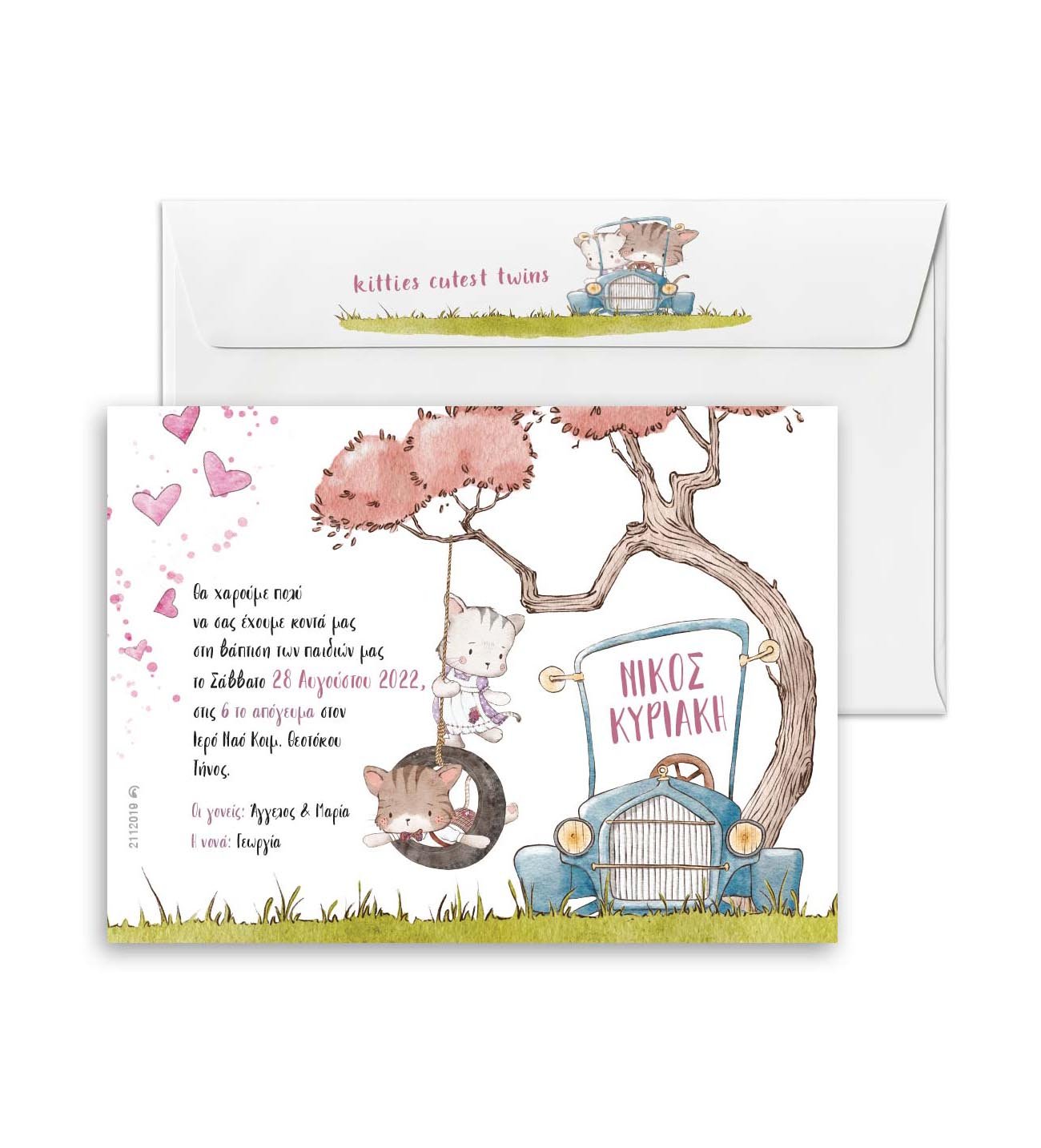 Προσκλητήριο βάπτισης, με θέμα για δίδυμα, γατάκια με αυτοκίνητο. ΜΕ ΦΑΚΕΛΟ. Διαστάσεις: 19εκ. x 14εκ. (Υπάρχει περίπτωση το τελικό να αποκλείνει 5% από τις παραπάνω διαστάσεις) Υλικό χαρτιού: Οπαλίνα 300 γραμμαρίων Προσοχή: Για να ισχύει η αγορά του προϊόντος πρέπει να αγοράσετε και την ΜΑΚΕΤΑ. Χρειαζόμαστε 7-10 εργάσιμες για την παραγωγή τους, από τη δική σας έγκριση, μετά την παραλαβή της μακέτας. Παρακαλούμε στα σχόλια γράψτε μας τις πληροφορίες για το προσκλητήριο, για γρηγορότερη παραγωγή μακέτας. 2112019