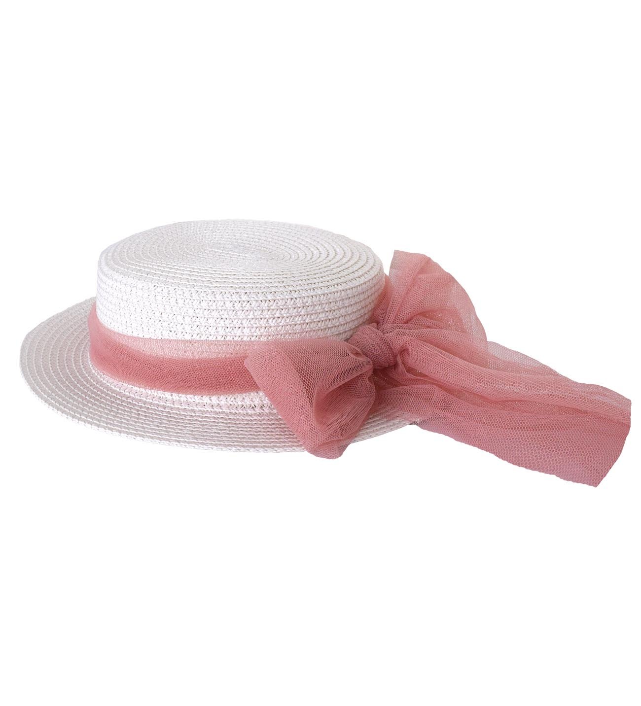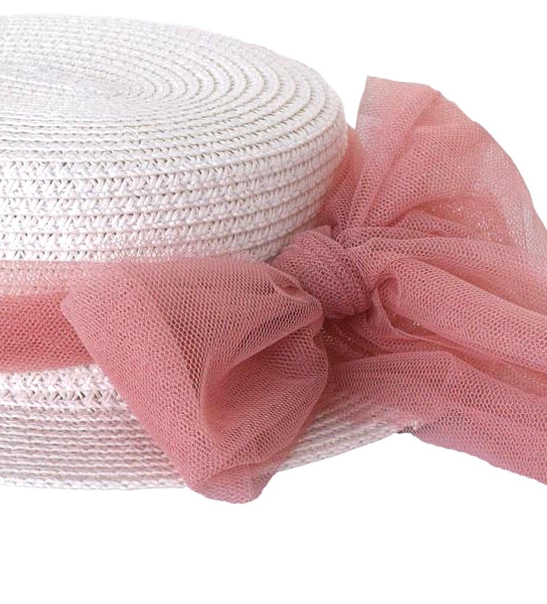Ψάθινο καπέλο βάπτισης στρογγυλό, σε λευκό χρώμα, με σάπιο μήλο τούλινο φιόγκο, ελληνικής παραγωγής.