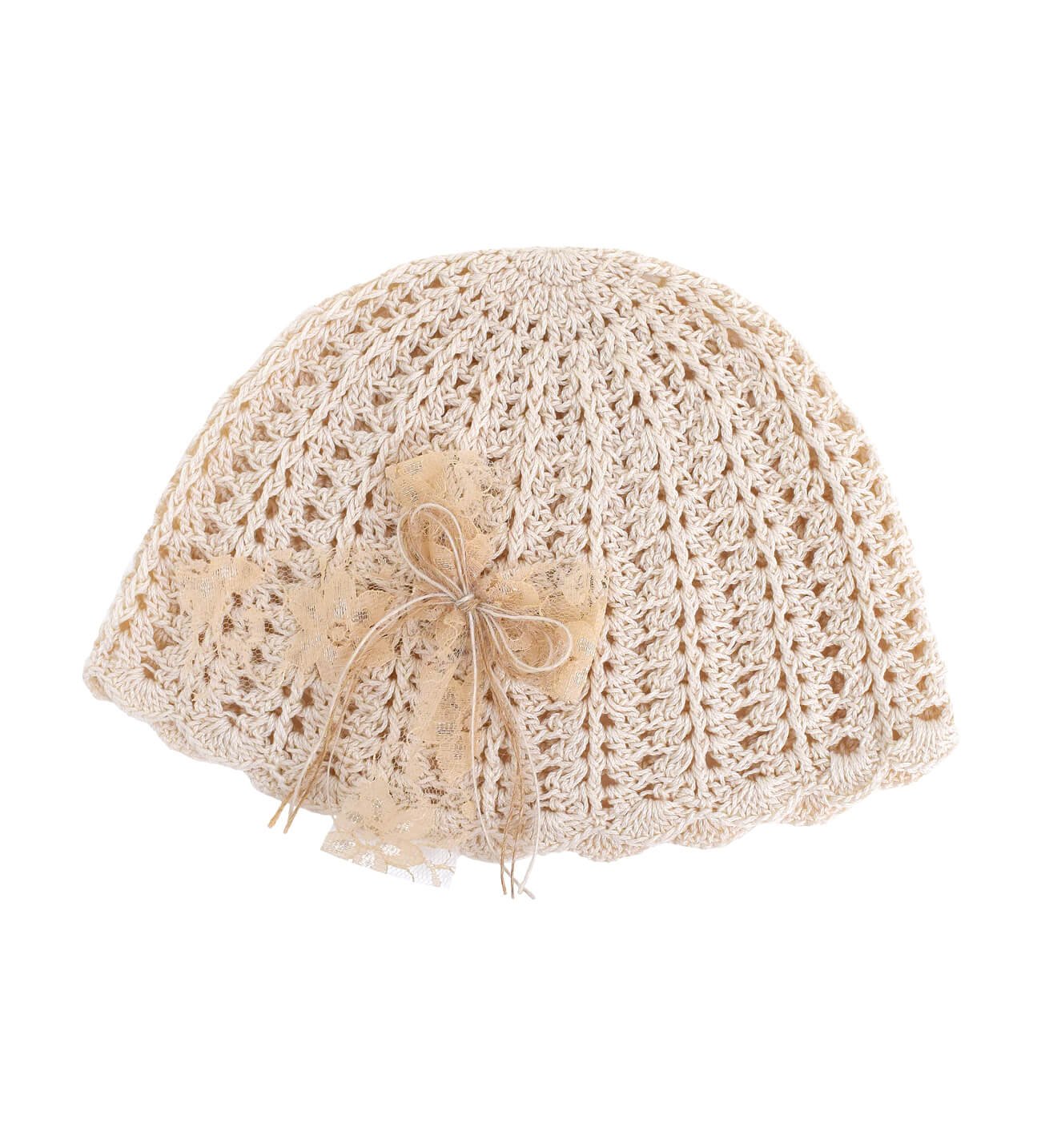 Σκουφάκι βάπτισης, πλεκτό στο χέρι από εκρού βαμβακερό νήμα με δαντελένιο φιογκάκι και σχοινάκια. Ελληνικής παραγωγής.